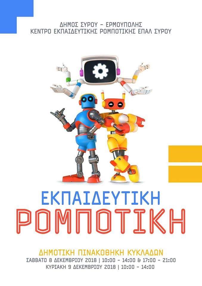Διήμερες εκδηλώσεις με στόχο τη γνωριμία μαθητών της Σύρου με την επιστήμη της εκπαιδευτικής ρομποτικής διοργανώνουν στην Πινακοθήκη Κυκλάδων, ο Δήμος Σύρου – Ερμούπολης και το Κέντρο Εκπαιδευτικής Ρομποτικής του ΕΠΑΛ Σύρου.