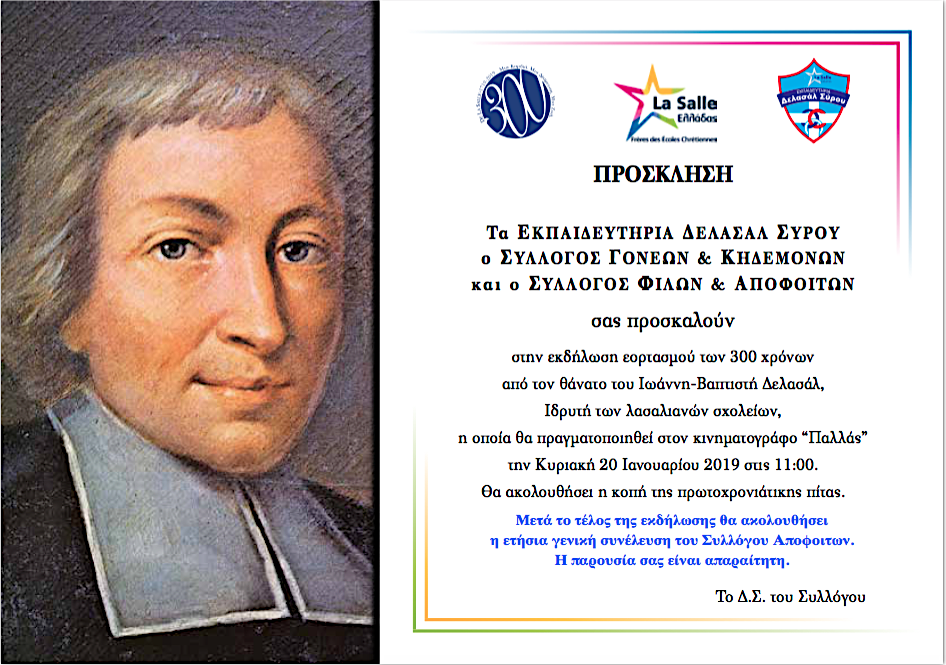 Τα Εκπαιδευτήρια Δελασάλ Σύρου, ο Σύλλογος Γονέων & Κηδεμόνων και ο Σύλλογος Φίλων & Αποφοίτων σας προσκαλούν στην εκδήλωση εορτασμού των 300 χρόνων από τον θάνατο του Ιωάννη-Βαπτιστή Δελασάλ, Ιδρυτή των λασαλιανών σχολείων, η οποία θα πραγματοποιηθεί στον Κινηματογράφο Παλλάς, την Κυριακή 20 Ιανουαρίου 2019 στις 11:00 π.μ.