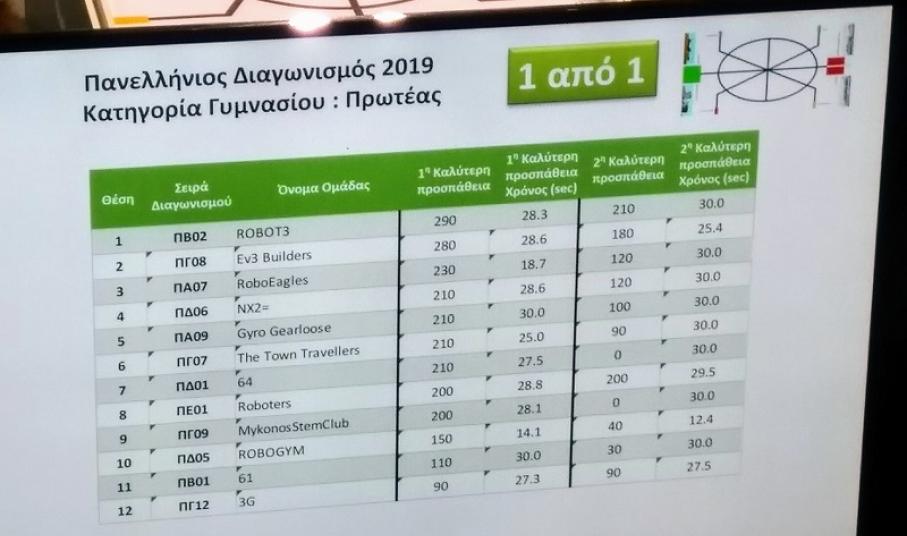 Η τριμελής ομάδα, αποτελούμενη από τους μαθητές Μάρκο Μανταδάκη, Πέτρο Μανταδάκη και Μάριο Ρούσσο διαγωνίστηκε μαζί με 53 ακόμη ομάδες στην εν λόγω κατηγορία και αφού πέρασε στη δεύτερη φάση του τελικού, κατάφερε να συγκεντρώσει την υψηλότερη βαθμολογία και να σκαρφαλώσει στην κορυφή της πρώτης 12άδας. Ένατη τερμάτισε η ομάδα «Mykonos Stem Club» των Ιδιωτικών Εκπαιδευτηρίων Μυκόνου «Σύγχρονη Παιδεία», ενώ στην 25η θέση βρέθηκε η δεύτερη ομάδα που προκρίθηκε στον τελικό από το νησί της Σύρου. Τις δύο ομάδες συνόδευσε ο εκπαιδευτικός Γιάννης Μαραγκός, ένας εκ των διδασκόντων του Κέντρου Εκπαιδευτικής Ρομποτικής που λειτουργεί από τα τέλη του προηγούμενου χρόνου στους χώρους των εργαστηρίων του Ημερήσιου ΕΠΑΛ Σύρου.