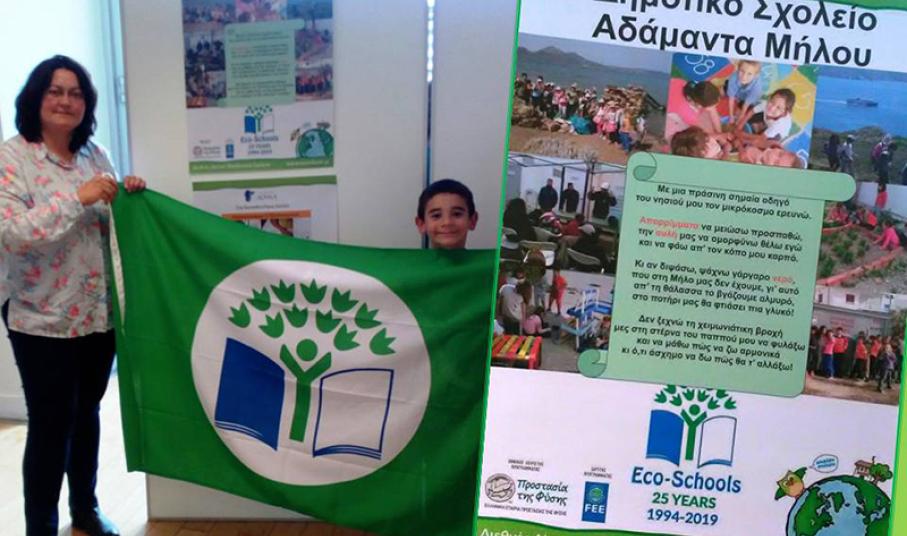 Για την επιτυχημένη συμμετοχή του στο Διεθνές Θεματικό Δίκτυο Περιβαλλοντικής Εκπαίδευσης «Οικολογικά Σχολεία» βραβεύτηκε για δεύτερη φορά το Δημοτικό Σχολείο Αδάμαντα Μήλου, παραλαμβάνοντας την πράσινη σημαία που φέρει το σήμα του προγράμματος.