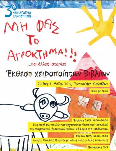 Τα παιδιά και οι Νηπιαγωγοί του 3ου Νηπιαγωγείου Ερμούπολης Σύρου, σας προσκαλούν στην έκθεση χειροποίητων βιβλίων, με τίτλο «Μη φας το αγρόκτημα… και άλλες ιστορίες!».