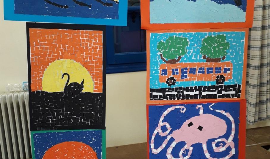 Στο μάθημα των Εικαστικών, οι μαθητές και οι μαθήτριες ασχολήθηκαν με την οφθαλμαπάτη και με τα ψυχρά, θερμά και βασικά χρώματα. Μεγάλη έμφαση δόθηκε και βαρύτητα στην τεχνική του ψηφιδωτού. «Με τις μεγάλες τάξεις ασχοληθήκαμε με τις κατασκευές από ανακυκλώσιμα υλικά. Πέρα από μια άσκηση που δουλέψαμε μαζί , μόνα τους τα παιδιά κατασκεύασαν ένα δικό τους παιχνίδι από ανακυκλώσιμα υλικά. Με τη θέληση και το πάθος που είχαν για το αποτέλεσμα, πέτυχαν στους στόχους τους! Όλα τα παιδιά, από την Γ’ τάξη μέχρι και την ΣΤ’ μέχρι ξεδίπλωσαν το ταλέντο τους και είμαστε πολύ περήφανοι γι’ αυτά!», σημείωσε ο υπεύθυνος εκπαιδευτικός Εικαστικών, Παναγιώτης Καλούδης.