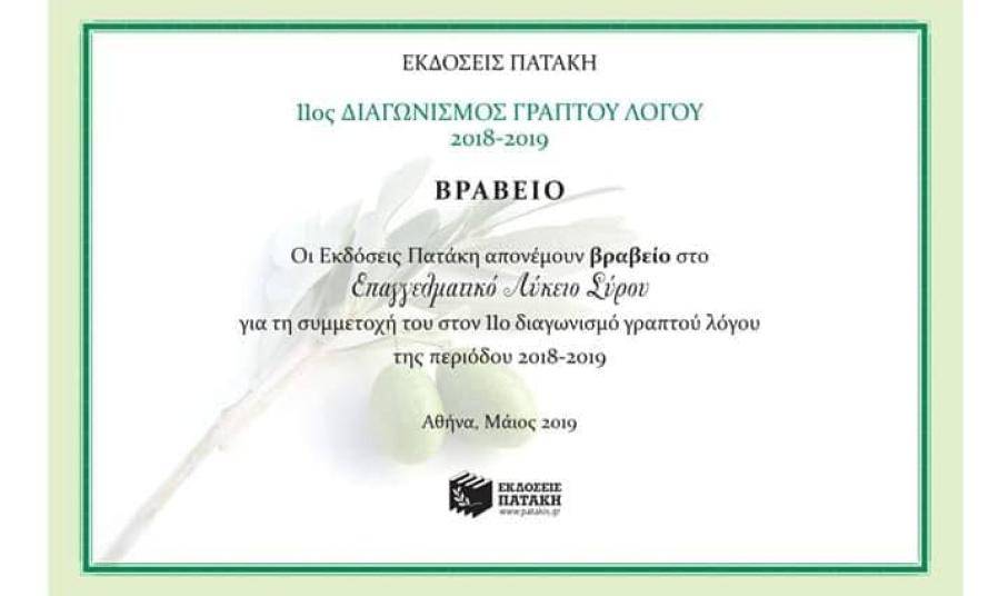 Οι προσδοκίες μας επαληθεύτηκαν με τη βράβευση του Επαγγελματικού Λυκείου Σύρου στον 11ο μαθητικό διαγωνισμό γραπτού λόγου που διοργανώθηκε από τις Εκδόσεις Πατάκη για τη χρονιά 2018-2019.