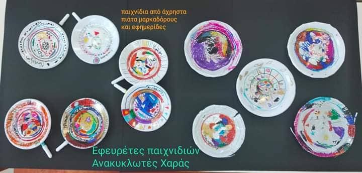 Στο πλαίσιο του eTwinning προγράμματος "Εφευρέτες Παιχνιδιών....οι Ανακυκλωτές της Χαράς", οι μικροί μαθητές αντί να πετάξουν τα πλαστικά πιάτα που χρησιμοποιήθηκαν για μία εργασία τους, εφευρίσκουν παιχνίδια, τα κατασκευάζουν, τα διακοσμούν και παίζουν με αυτά. Χρησιμοποιημένα πλαστικά πιάτα, χαλασμένοι μαρκαδόροι και χαρτομπαλάκια από παλαιές εφημερίδες αποτελούν τα βασικά υλικά των παιδιών που αποδεικνύουν ότι τίποτα στη ζωή δεν απαιτεί κόπο, αλλά τρόπο για να μπορέσει να πάρει σάρκα και οστά και να σκορπίσει χαρά. Ανάμεσα στα «έργα» που έχουν δημιουργηθεί μέχρι τώρα από τα χέρια τους συναντούμε δίσκους από πλαστικά πιάτα, ρακέτες από πλαστικά πιάτα και λαβή από μαρκαδόρους και δύο νέα παζλ από σακούλα με κεράσματα γενεθλίων και χαρτόκουτο.