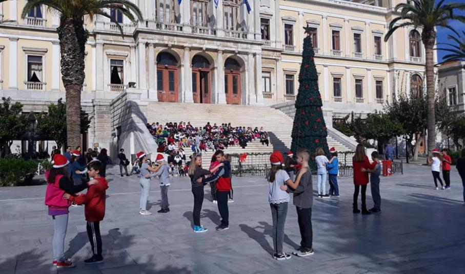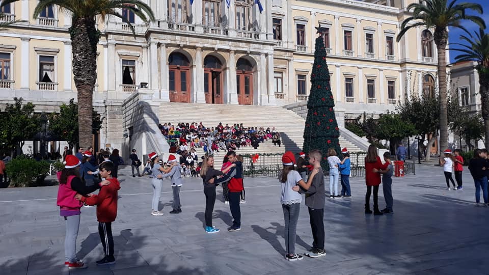 Ο επίλογος της φετινής εκδήλωσης δόθηκε στην πλατεία Μιαούλη με τους μαθητές να χορεύουν τόσο σε ζευγάρια, όσο και όλοι μαζί μπροστά από το εντυπωσιακό χριστουγεννιάτικο δέντρο. Αμέσως μετά, παιδιά και εκπαιδευτικοί εισήλθαν στο Δημαρχείο όπου τραγούδησαν τα κάλαντα στον Δήμαρχο Σύρου – Ερμούπολης, Νίκο Λειβαδάρα.