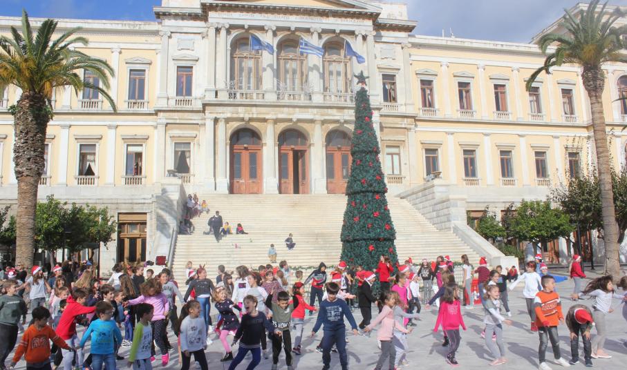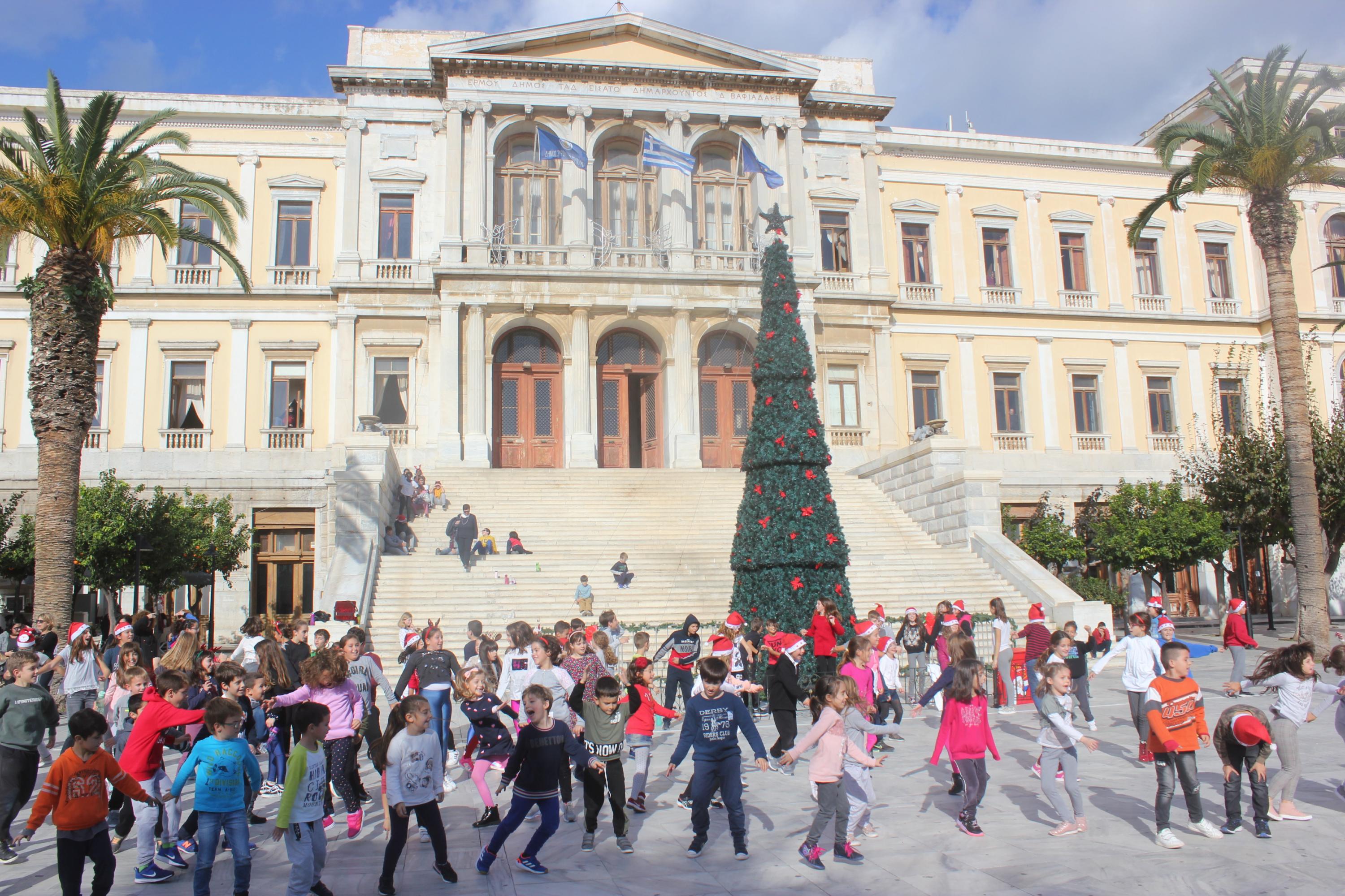 Χαμόγελα σε γονείς και περαστικούς της Πλατείας Μιαούλη σκόρπισαν την περασμένη Παρασκευή οι μαθητές και οι μαθήτριες του 1ου Δημοτικού Σχολείου Ερμούπολης, ολοκληρώνοντας τη φετινή χριστουγεννιάτικη γιορτή τους με φόντο το επιβλητικό Δημαρχείο.