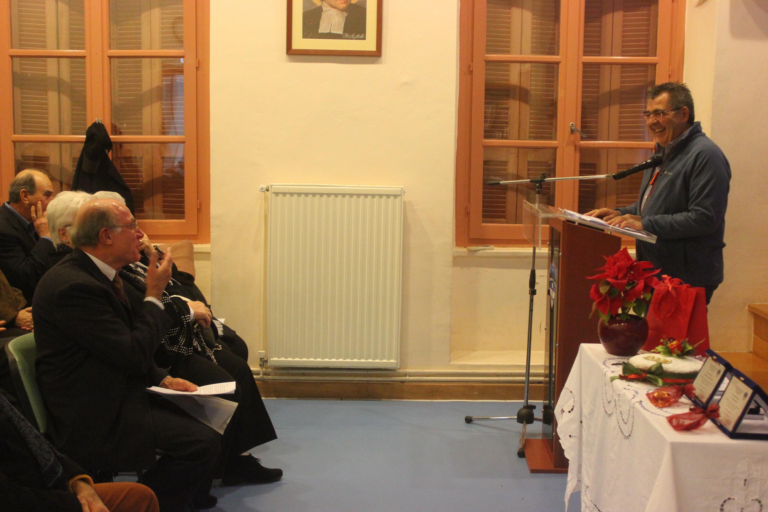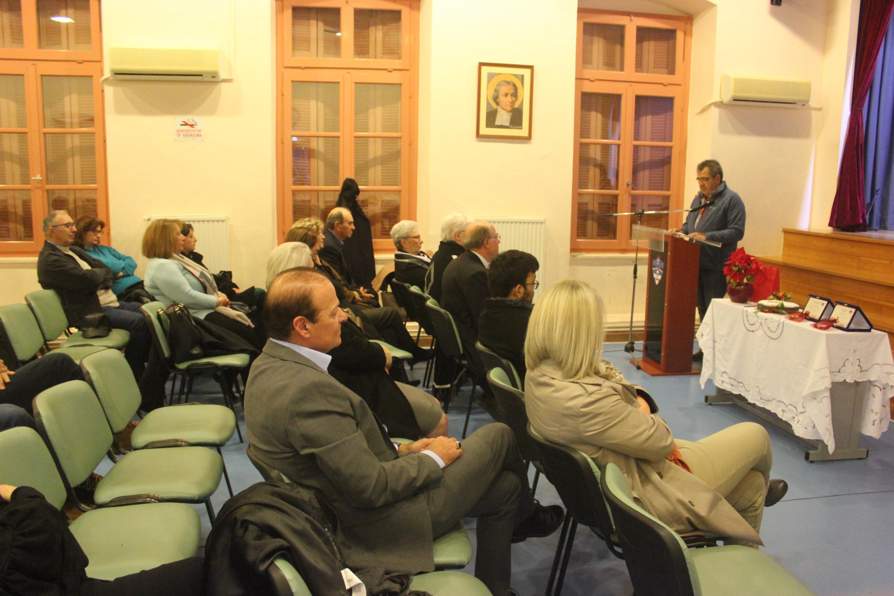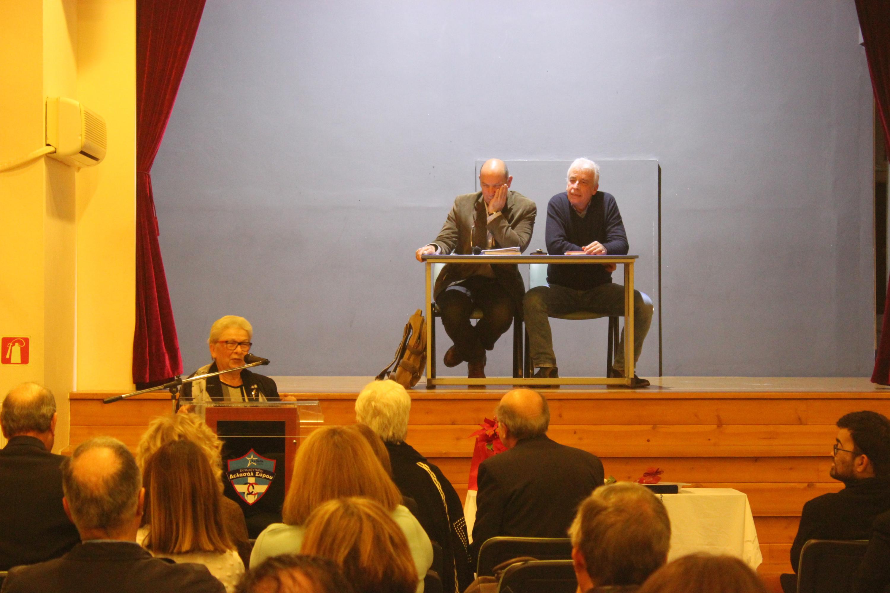 Το κύριο μέρος της εκδήλωσης προλόγισε ο Αντιπρόεδρος του Συλλόγου κ. Γιώργος Βακόνδιος. Όπως ανέφερε, στην πορεία του Ιδιωτικού Δημοτικού Σχολείου «Άγιος Γεώργιος», τον πρώτο αιώνα λειτουργίας του, πολλοί Frères και λαϊκοί εκπαιδευτικοί υπηρέτησαν τη λασαλιανή αποστολή στην Ελλάδα και ειδικότερα στο νησί της Σύρου. Αρκετοί από τους Φρερ, κατά τη διάρκεια της ζωής τους, από προσωπική επιλογή διαφοροποιήθηκαν και αποχώρησαν από τις τάξεις των μοναχών αδελφών του τάγματος χωρίς βέβαια να αποποιηθούν τις παιδαγωγικές αρχές στις οποίες είχαν μυηθεί, ζώντας και προσφέροντας πολλά χρόνια μέσα στα λασαλιανά σχολεία. Σύμφωνα με τον κ. Βακόνδιο, «η εσωστρεφής νοοτροπία των τότε ιθυνόντων του τάγματος στη χώρα μας δεν τους επέτρεψε να συνεχίσουν με την ιδιότητα του λαϊκού τις υπηρεσίες τους, επιλέγοντας αντί αυτών δασκάλους άσχετους με τις αρχές των λασαλιανών σχολείων, ορισμένοι από τους οποίους αμφιβόλου ηθικής και ικανοτήτων». Η μετέπειτα αλλαγή νοοτροπίας έδωσε τη δυνατότητα σε ικανά στελέχη μέσα από το λασαλιανό δίκτυο ως λαϊκοί, σε συνεργασία με τους Frères να αναπτύξουν και να εκσυγχρονίσουν τα σχολεία.