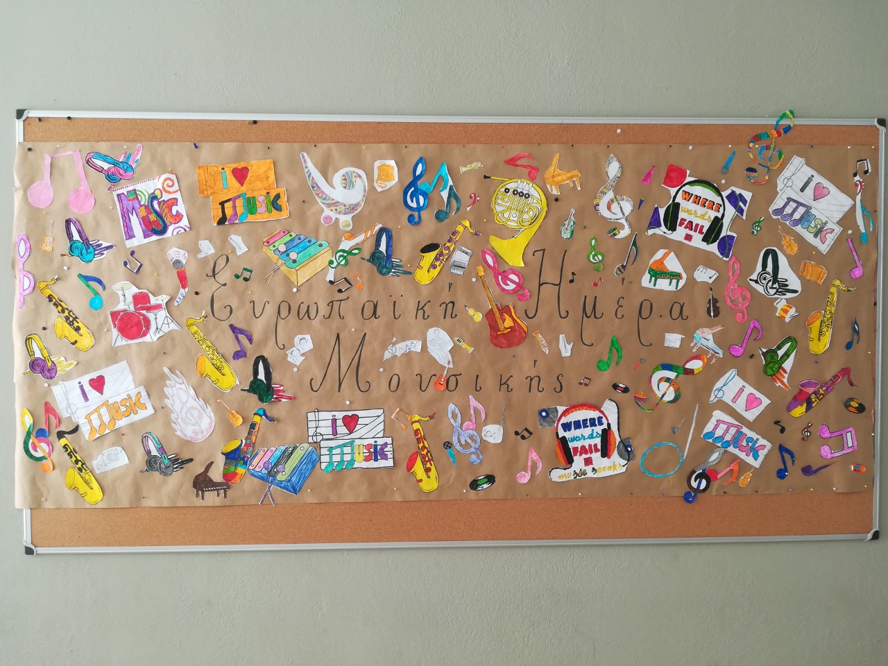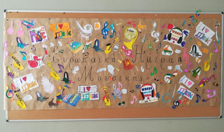 Παράλληλα, οι μαθητές των Γ', Δ' Ε' και ΣΤ' τάξεων συμμετείχαν στην κατασκευή καλλιτεχνικού μουσικού πίνακα κολλάζ αφιερωμένου στον εορτασμό της ημέρας.