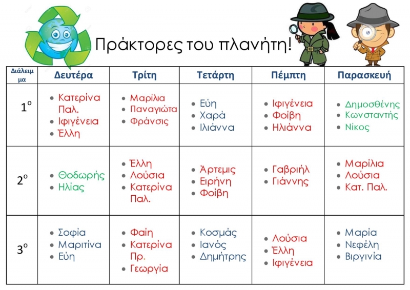 Παιδιά των Δ'-Ε'-Στ' τάξεων ανέλαβαν εθελοντικά -σε μικρές ομάδες με βάρδιες και καθορισμένο πρόγραμμα που αλλάζει ανα τρίμηνο- τον ρόλο των "Πρακτόρων" οι οποίοι βρίσκονται σε κάθε διάλειμμα στους κάδους και καθοδηγούν τα μικρότερα παιδιά στο "πού να πετάξουν τι". Τα ίδια παιδιά συλλέγουν στο τέλος κάθε διαλείμματος τα σκουπίδια που βρίσκονται κάτω και ενημερώνουν τις εκπαιδευτικούς για την ποσότητά τους.