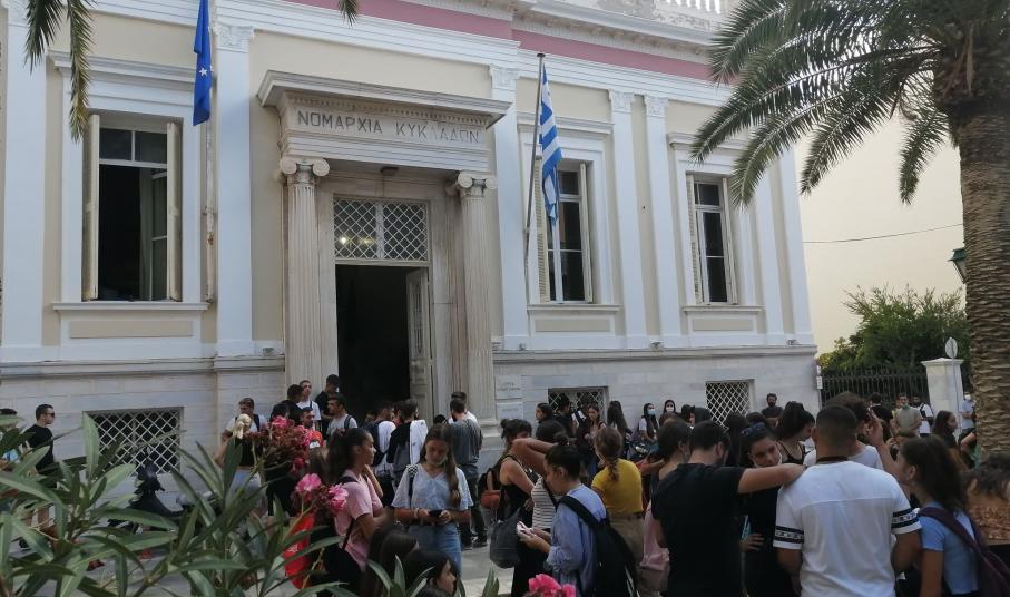 Η πορεία των μαθητών κατέληξε στο κτήριο της έδρας της Περιφέρειας Νοτίου Αιγαίου, στην πλατεία Τσιροπινά στην Ερμούπολη, όπου εκπρόσωποι των δύο Λυκείων είχαν την ευκαιρία να συνομιλήσουν και με τον Αντιπεριφερειάρχη Κυκλάδων, στον οποίο εξέθεσαν τα αιτήματά τους αλλά και τις θέσεις τους περί ανετοιμότητας της κυβέρνησης να σχεδιάσει, εντός έξι μηνών, ένα ασφαλές πλαίσιο λειτουργίας των σχολικών μονάδων. Ο Αντιπεριφερειάρχης άκουσε τους μαθητές, ωστόσο δήλωσε αναρμόδιος για την ικανοποίησή τους, καθώς αρμοδιότητα έχει το Υπουργείο Παιδείας.