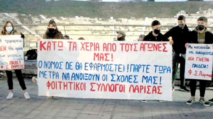 Διαμαρτυρία με πανό και συνθήματα μπροστά από το Αρχαίο Θέατρο και πορεία σε κεντρικούς δρόμους της πόλης πραγματοποίησαν χθες το απόγευμα οι Φοιτητικοί Σύλλογοι Λάρισας, για τα επεισόδια που σημειώθηκαν χθες το πρωί στο Αριστοτέλειο Πανεπιστήμιο Θεσσαλονίκης. Οι Φοιτητικοί Σύλλογοι της Λάρισας στο κάλεσμά τους για τη χθεσινή κινητοποίηση σημειώνουν «Κάτω τα χέρια από τους αγώνες μας! Η κυβέρνηση θα μας βρει απέναντί της! Η τρομοκρατία δεν θα περάσει! Καταγγέλλουμε την εισαγγελική παρέμβαση που διατάχθηκε με εντολή του πρύτανη του ΑΠΘ απέναντι στην κινητοποίηση - κατάληψη που πραγματοποιήθηκε με πρωτοβουλία Φοιτητικών Συλλόγων της Θεσσαλονίκης. Δυνάμεις των ΜΑΤ και της Αστυνομίας καταστείλανε την κινητοποίηση Φοιτητικών Συλλόγων που διεκδικούν το αυτονόητο άνοιγμα των σχολών τους. Γίνεται ξεκάθαρο τι εξυπηρετεί ο νόμος Κεραμέως - Χρυσοχοΐδη και σε ποιους αναφέρεται. Απέναντι στον δίκαιο αγώνα μας η κυβέρνηση απαντάει με καταστολή και προσαγωγές φοιτητών. Κάθε προσπάθεια να μας φοβίσουν και να συκοφαντήσουν τον αγώνα μας θα πέφτει στο κενό! Οι φοιτητές συνεχίζουμε δυναμικά! Οργανώνουμε τον αγώνα μας μέσα από τους Φοιτητικούς Συλλόγους και τους χαλάμε τα σχέδια. Η τρομοκρατία δεν θα περάσει! Ο νόμος Κεραμέως - Χρυσοχοΐδη θα μείνει στα χαρτιά!».