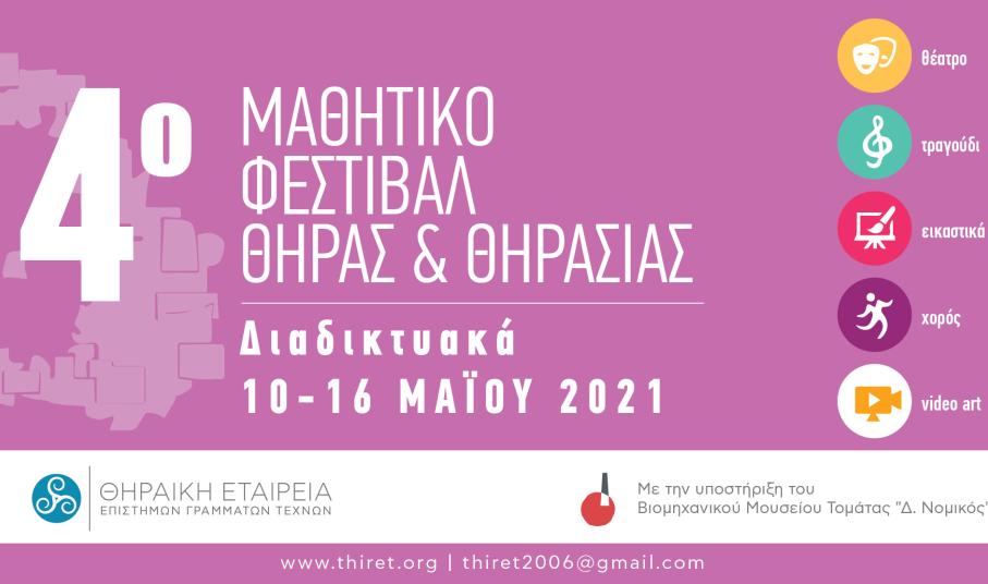Το 4 ο Μαθητικό Φεστιβάλ Θήρας και Θηρασίας θα πραγματοποιηθεί την εβδομάδα 10-16 Μαΐου 2021. Κατά τη διάρκεια της εβδομάδας αυτής θα προβάλλονται τα έργα και οι δράσεις των παιδιών μας, δίνοντας τους έτσι ένα βήμα για έκφραση, επικοινωνία και αλληλεπίδραση. Η φετινή θεματολογία είναι ελεύθερη, αρκεί να μπορεί να προβληθεί διαδικτυακά.