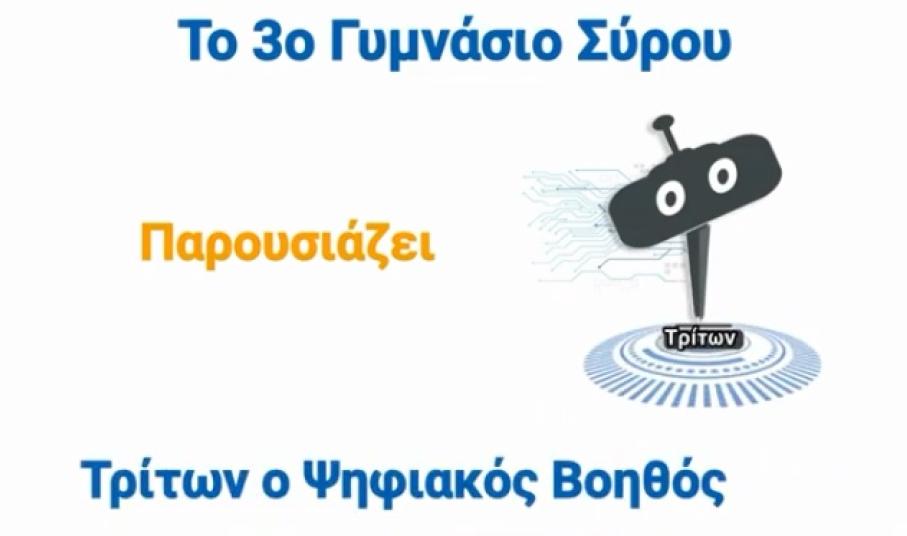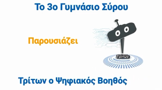 Τέλος, οι μαθητές της Γ’ Τάξης του 3ου Γυμνασίου Σύρου, Δήμητρα Βακονδίου, Αντώνης Μακρυωνίτης, Αλεξάνδρα Μάρα, θα παρουσιάσουν τον Τρίτωνα, τον Ψηφιακό Βοηθό του σχολείου. Στην ιστοσελίδα του 3ου Γυμνασίου δημιουργήθηκε ένα chatbot για την ενημέρωση των μαθητών και των γονέων και κηδεμόνων τους. Με βάση ένα δωρεάν plugin για το Wordpress δημιουργήθηκαν απαντήσεις σε ερωτήσεις, μενού επιλογών και αναζήτηση στο site του σχολείου βάσει της λέξης κλειδί που θα πληκτρολογήσει ο χρήστης. Μπορεί να απαντήσει σχεδόν σε ότι λέξη πληκτρολογήσει ο χρήστης ενώ ενσωματώνει και φόρμες επικοινωνίας με το σχολείο, με αντίστοιχη προώθηση email στο σχολείο μας. Για να δείτε σε λειτουργία το Chatbot του σχολείου αρκεί να επισκεφθείτε την ιστοσελίδα του σχολείου htttp://3gym-syrou.gr και στο αναδυόμενο παράθυρο του ψηφιακού βοηθού να πληκτρολογήσετε μία ή περισσότερες λέξεις για αναζήτηση ή να επιλέξετε κάτι από το μενού. Υπεύθυνος καθηγητής: Ανδρέας Γεωργίου.
