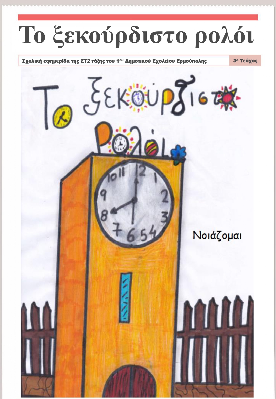 Η ανάγκη για δημιουργία και επικοινωνία οδήγησε τις μαθήτριες και τους μαθητές της ΣΤ’ Τάξης του 1ου Δημοτικού Σχολείου Ερμούπολης στην έκδοση ηλεκτρονικής εφημερίδας, μιας και είναι ο μοναδικός τρόπος σε αυτές τις δύσκολες συνθήκες. Η ιστορία, η Υγεία, η Λογοτεχνία, η Παράδοση και το Παιχνίδι τρυπώνουν κάθε μήνα στις σελίδες του «Ξεκούρδιστου Ρολογιού» που έχει αγκαλιαστεί θερμά τόσο από την κοινωνία της Σύρου. Υπεύθυνη εκπαιδευτικός: Ελισάβετ Αποστολίδου.
