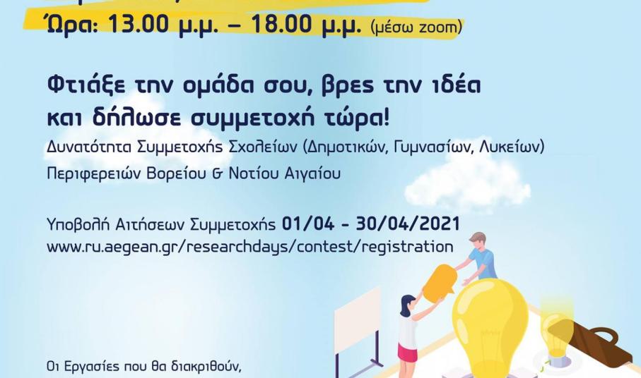 Στο πλαίσιο των «Ημερών Καινοτομίας & Έρευνας Δημήτρης Εδουάρδος Γαρδίκης», το Πανεπιστήμιο Αιγαίου διοργανώνει τον 1ο Διαγωνισμό Έρευνας για μαθητές της Πρωτοβάθμιας και Δευτεροβάθμιας Εκπαίδευσης Βορείου και Νοτίου Αιγαίου.
