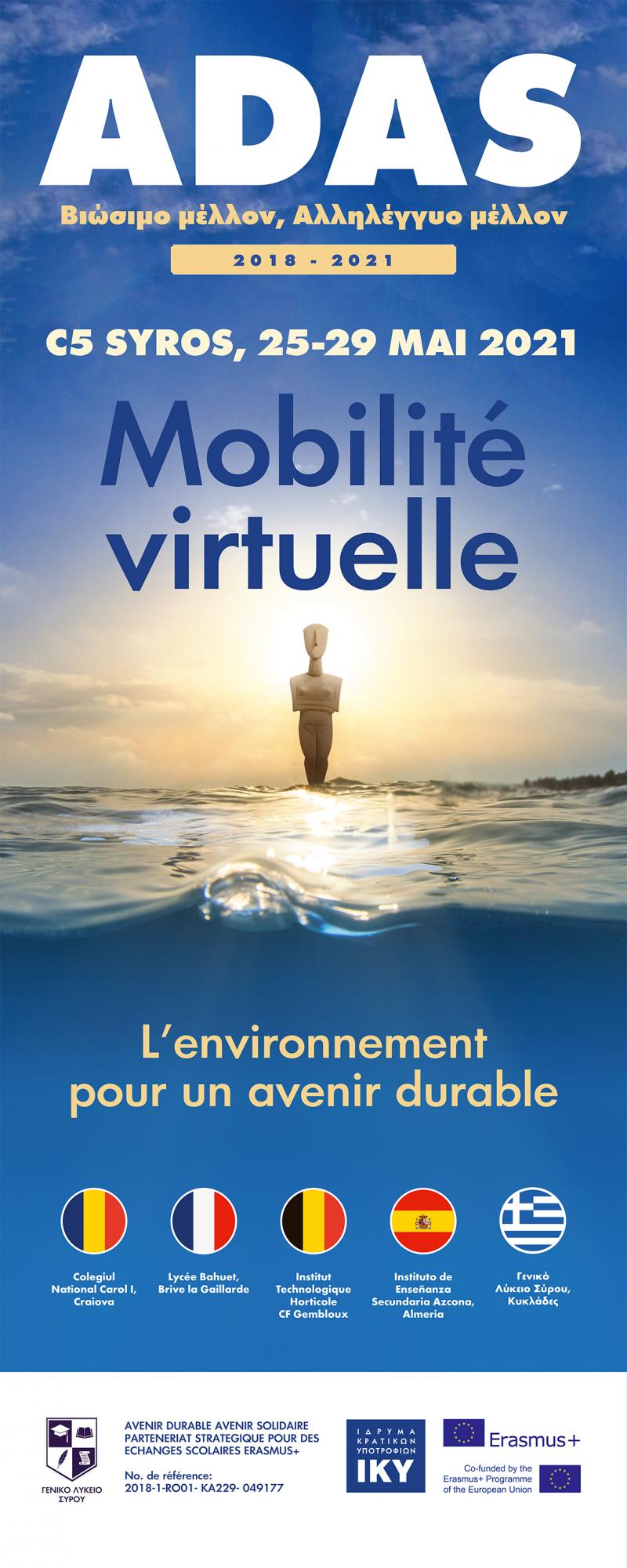 Αυτή η τελευταία κινητικότητα με διοργανωτή το σχολείο μας έλαβε χώρα από 25-29 Μαϊου 2021 στο ΓΕΛ Σύρου και είχε θέμα την βιώσιμη ανάπτυξη με έμφαση στο περιβάλλον. Λόγω της πανδημίας δυστυχώς δεν ήταν δυνατή η αυτοπρόσωπη παρουσία των μαθητών και των καθηγητών των συνεργαζόμενων σχολείων από τη Γαλλία το Lycee Bahuet, Brive la Gaillard , από το Βέλγιο το Institut Horticole Gembloux, από την Ισπανία Instituto de Ensenanza Secundaria Azcona, Almeria, και από τη Ρουμανία το Colegiul National Carol I Craiova .