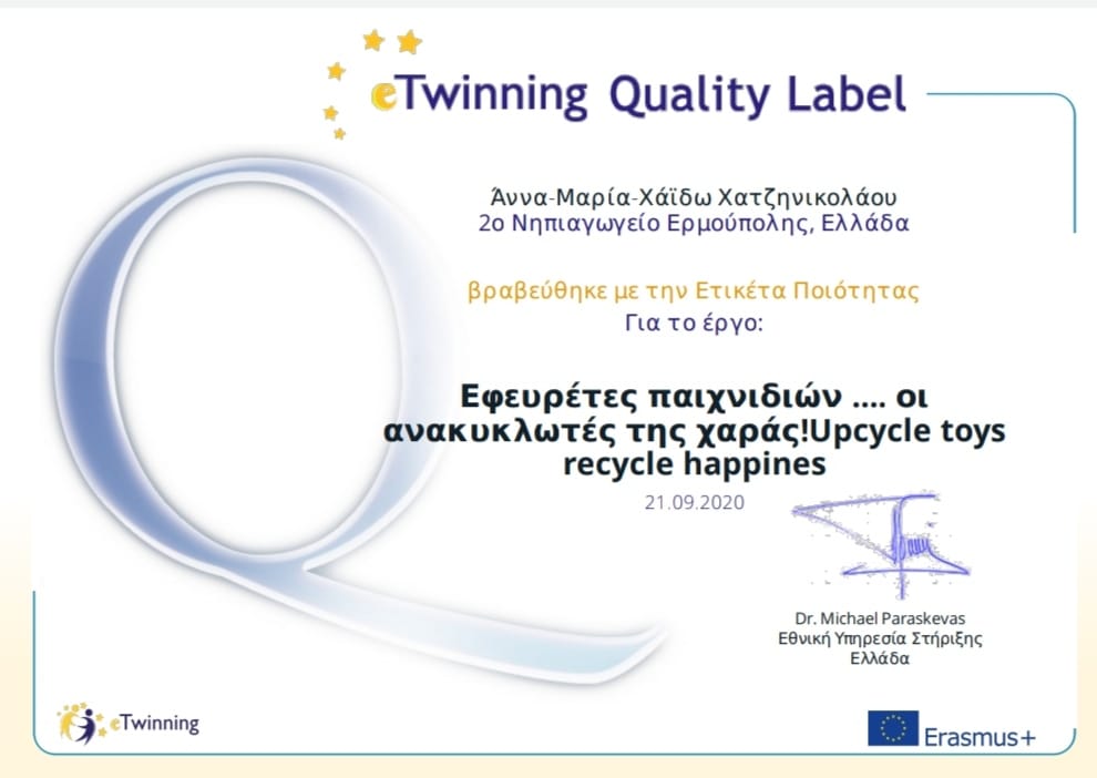 Το πρόγραμμα περιβαλλοντικής ευαισθητοποίησης με τίτλο «Εφευρέτες παιχνιδιών…οι ανακυκλωτές της χαράς» υλοποιήθηκε στα πλαίσια μιας eTwinning συνεργασίας στην οποία συμμετείχαν τα εξής Νηπιαγωγεία:
