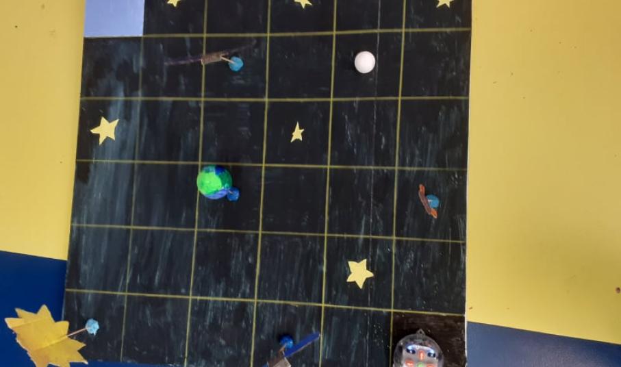 Τα παιδιά επέλεξαν τη θεματική της καθώς και τα στοιχεία που θα περιλαμβάνει. Πιο συγκεκριμένα, η γη και η σελήνη κατασκευασμένες από αφρολεξένιες μπάλες ζωγραφίστηκαν από αυτά, τα οποία βλέποντας τες σε εικόνα επέλεξαν τα αντίστοιχα χρώματα που θα τις αποτύπωναν πιο πιστά. Επιπλέον, τα διάσπαρτα αστέρια της μακέτας είναι σχεδιασμένα και κομμένα από τα ίδια. Οι δορυφόροι, ο πύραυλος και ο ήλιος κατασκευασμένοι από χαρτόκουτα σχεδιάστηκαν από την προπονήτρια και στη συνέχεια κόπηκαν και χρωματίστηκαν ελεύθερα από τα ίδια τα παιδιά.