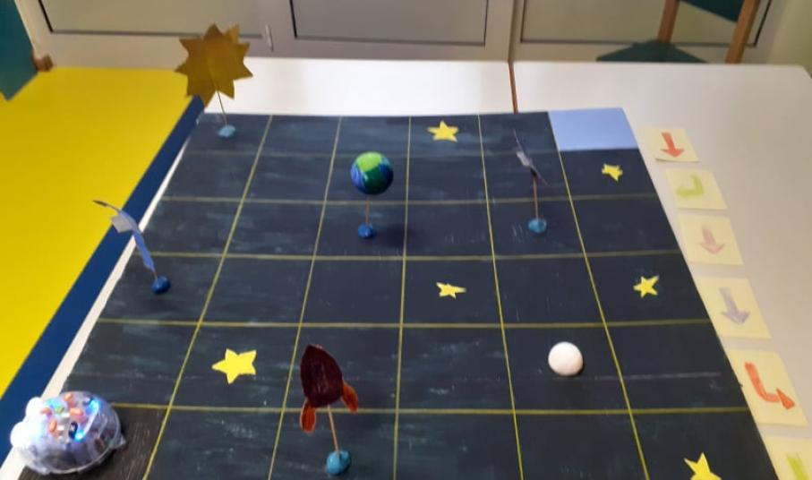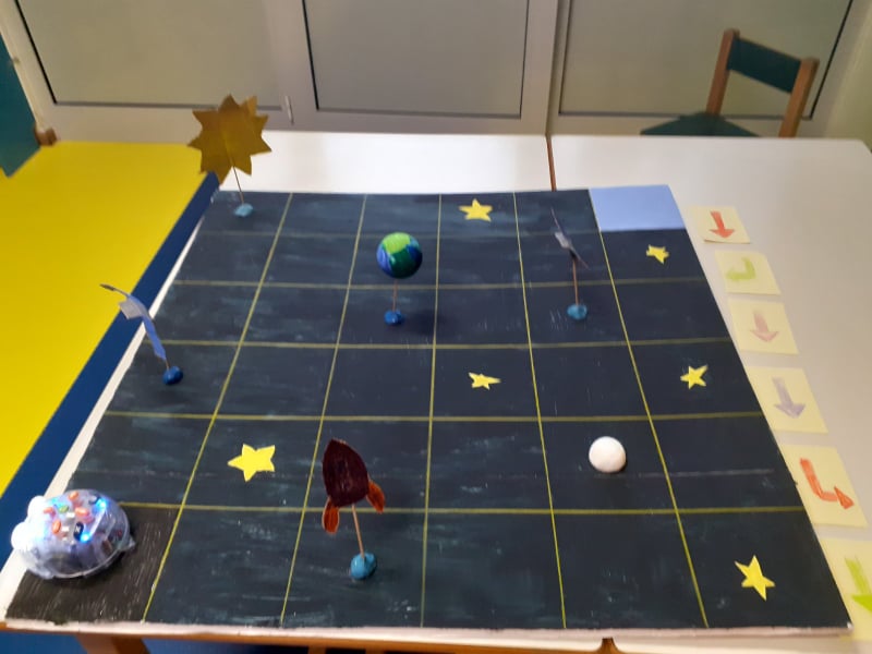 Οι μαθητές του Νηπιαγωγείου δημιούργησαν ομάδες των 3-6 παιδιών και ασχολήθηκαν με τον Γαλαξία. Στο πλαίσιο αυτό, κάθε ομάδα κατασκεύασε μια επιδαπέδια πίστα που είναι φτιαγμένη από υλικά της αρεσκείας της και απεικονίζει, με τρισδιάστατο τρόπο, το γαλαξία μας/ το ηλιακό μας σύστημα. Με βοηθό ένα επιδαπέδιο ρομπότ που κινείται ανάμεσα από πλανήτες, κομήτες, αστεροειδείς, νεφελώματα, σύμφωνα με τις εντολές που του δίνουν τα παιδιά, οι ομάδες μας δείχνουν πώς είναι το ηλιακό μας σύστημα και το διάστημα και μας κάνουν κατανοητό πως η Γη, το σπίτι μας, είναι μέρος ενός ευρύτερου συστήματος. Μέσα από αυτή τη δραστηριότητα, οι μαθητές δημιούργησαν τον πρώτο τους αλγόριθμο.