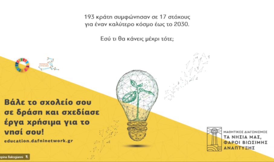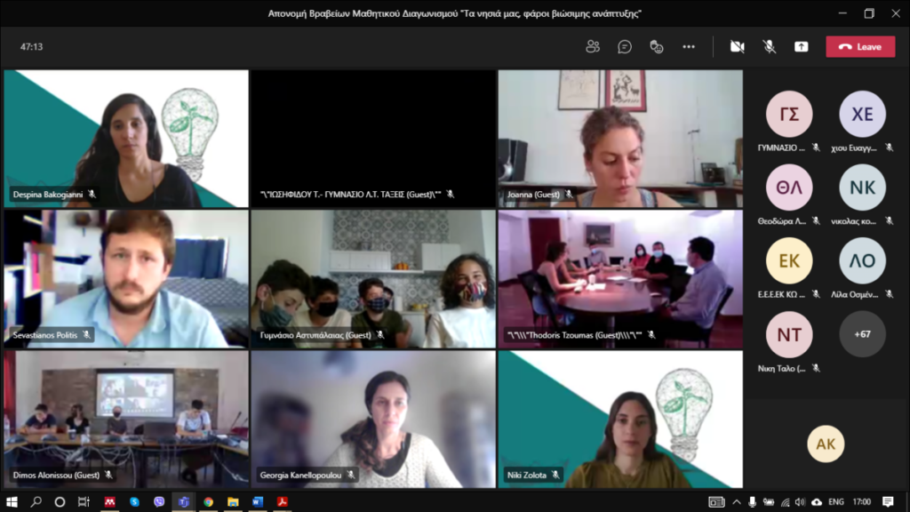 Ο 1ος Μαθητικός Διαγωνισμός «Τα νησιά μας, φάροι βιώσιμης ανάπτυξης» ολοκληρώθηκε σε ένα γιορτινό και ευχάριστο κλίμα με την Απονομή Βραβείων που πραγματοποιήθηκε διαδικτυακά, παρουσία της κας Αλεξάνδρας Σδούκου, Γ.Γ. του Υπουργείου Περιβάλλοντος & Ενέργειας.