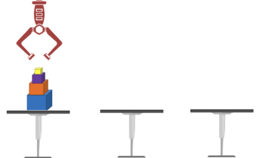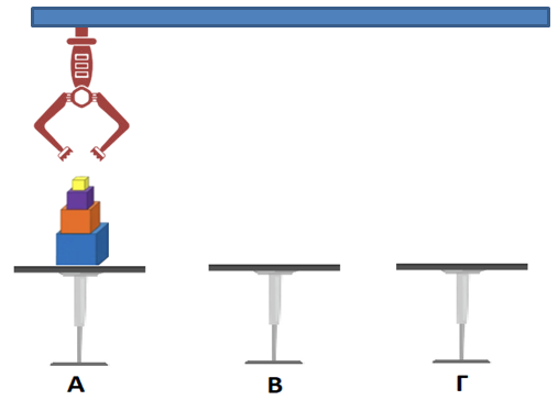 Τα παιδιά καλούνται να γράψουν τη σειρά των κινήσεων που πρέπει να κάνει ο βραχίονας ώστε να μεταφερθούν όλοι οι κύβοι από το Α τραπέζι στο Γ και να τοποθετηθούν με την ίδια σειρά (κάτω κάτω ο μπλε, από πάνω του ο πορτοκαλί,  πάνω από αυτόν ο μωβ και στην κορφή της στοίβας ο κίτρινος).