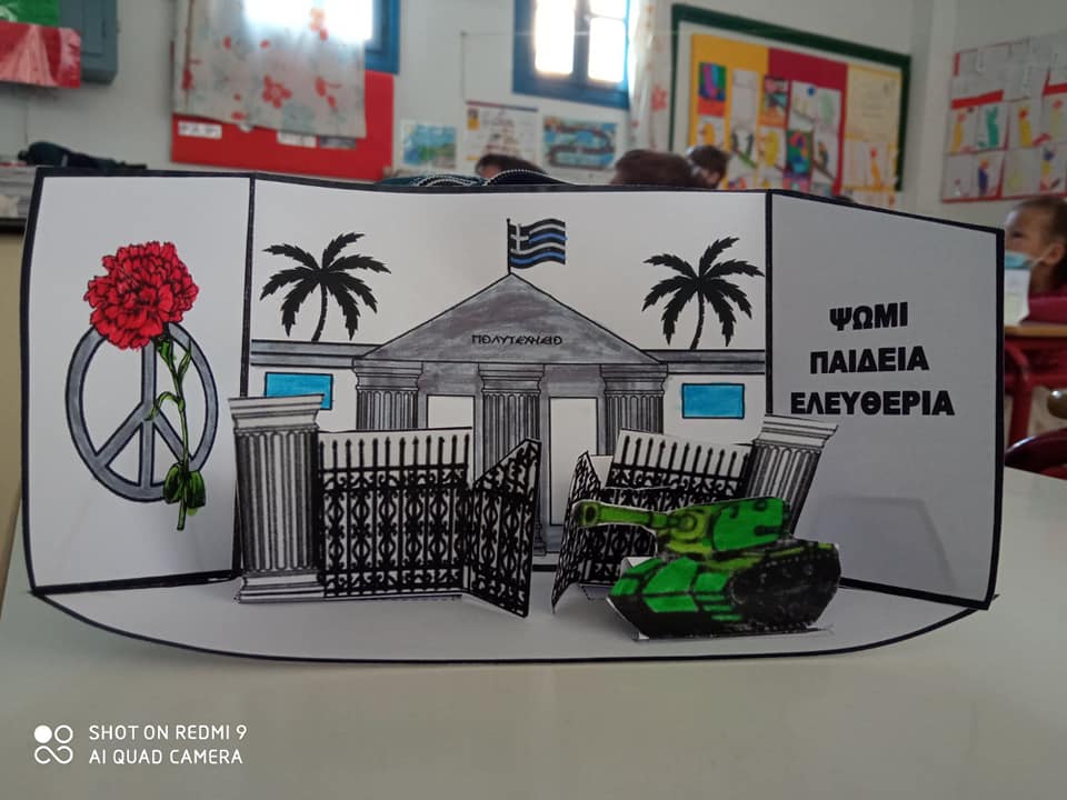 Με πολλούς και διαφορετικούς τρόπους εορτάστηκε η μνήμη της εξέγερσης και στο 4ο Πειραματικό Δημοτικό Σχολείο Ερμούπολης. Τα παιδιά του Δ1 έγραψαν τι σημαίνει για τους ίδιους «ελευθερία», στη συνέχεια παρακολούθησαν βουβό βίντεο μικρού μήκους με τίτλο "chromophobia" . Μοιράστηκαν σε δύο ομάδες και παρουσίασαν με το σώμα τους τα κυρίαρχα συναισθήματα. Τέλος, έδωσαν φωνή στα συναισθήματα και συζήτησαν την εμπειρία τους. Από την άλλη, τα παιδιά της Β' με τη βοήθεια της δασκάλας τους έφτιαξαν το Πολυτεχνείο σε τρισδιάστατη κατασκευή.
