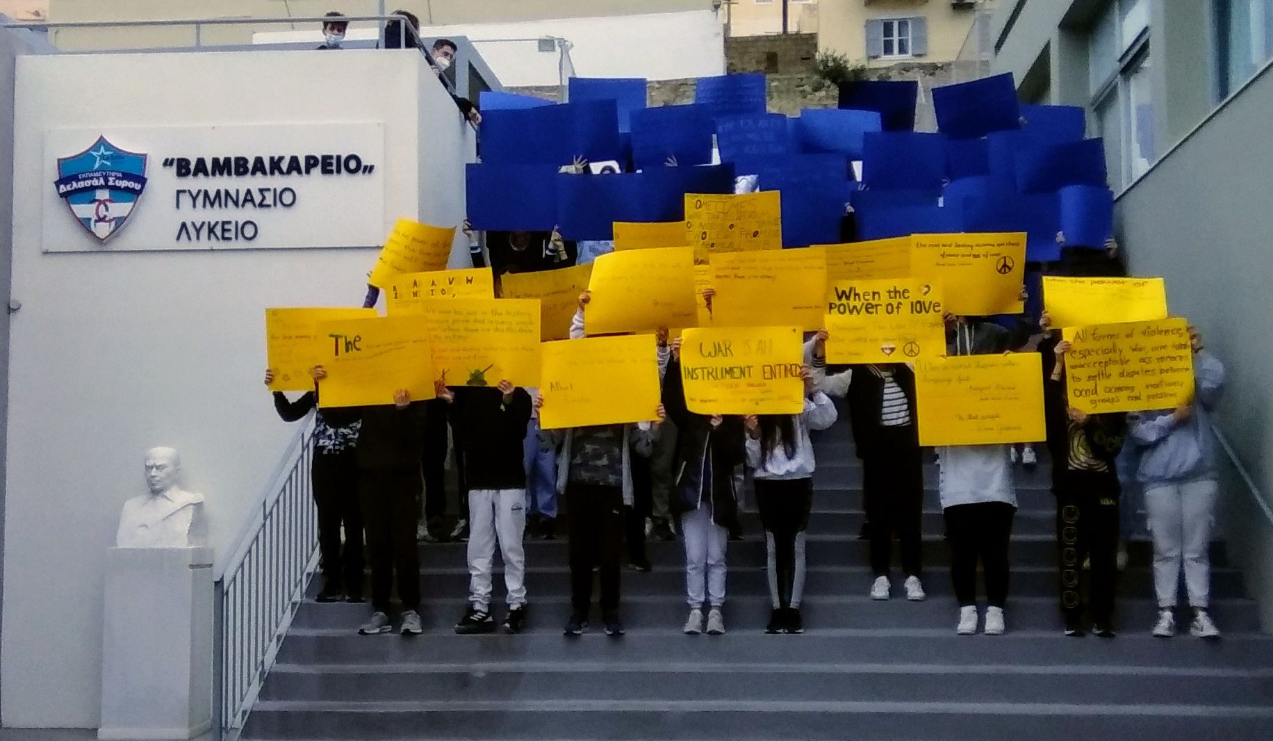 «Το Γυμνάσιο και Λύκειο των Εκπαιδευτηρίων Δελασάλ Σύρου, δίνουμε το δικό Μ.Α.Σ. μήνυμα συμπαράστασης στον λαό της Ουκρανίας και ενώνουμε τις φωνές μας με όλα τα παιδιά του κόσμου για να σταματήσει ο πόλεμος».