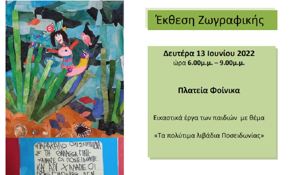 Με την υποστήριξη της τοπικής κοινότητας Φοίνικα και του Συλλόγου Γονέων του νηπιαγωγείου μας, διοργανώνουμε υπαίθρια εικαστική  των έργων των παιδιών, την Δευτέρα 13 Ιουνίου 2022, και ώρα 6.00μ.μ. – 9.00μ.μ.