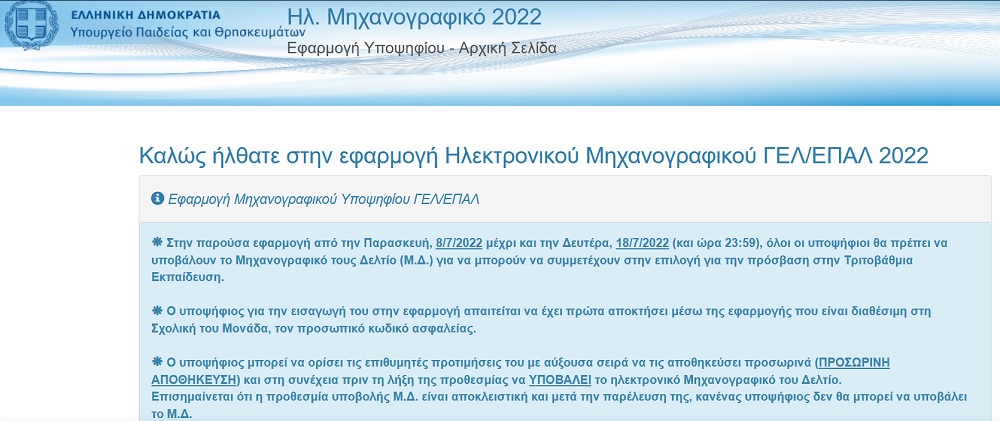 Από το Υπουργείο Παιδείας και Θρησκευμάτων ανακοινώνεται ότι οι διαδικασίες για την υποβολή των Μηχανογραφικών Δελτίων (Μ.Δ. και Π.Μ.Δ) έτους 2022 ξεκίνησαν από την Παρασκευή 8 Ιουλίου 2022 και λήγουν την Δευτέρα 18 Ιουλίου 2022.