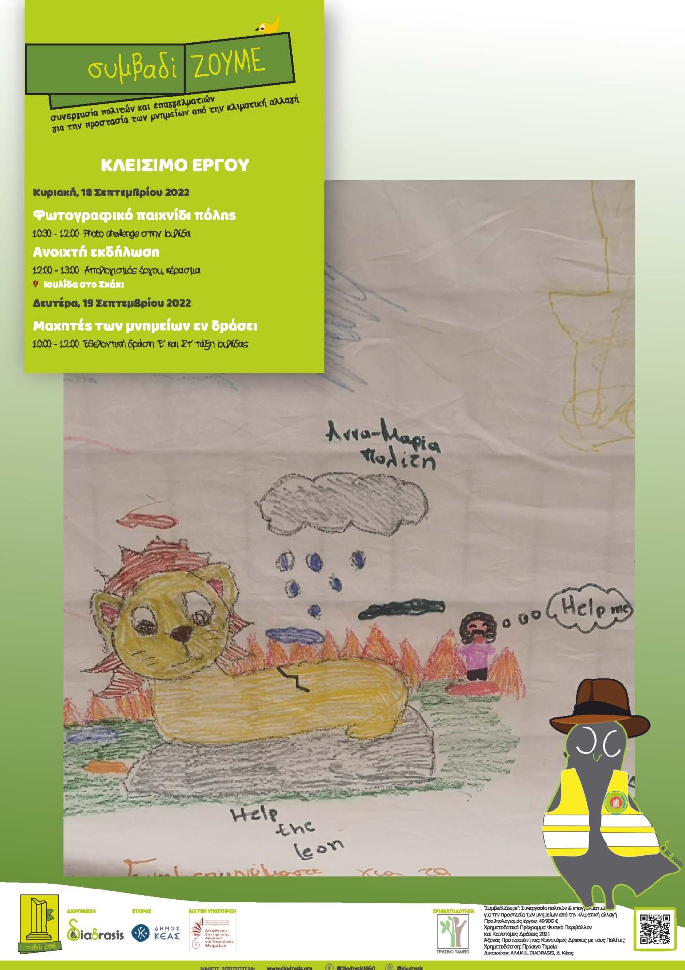 Στο πλαίσιο των εορτασμών των Ευρωπαϊκών Ημερών Πολιτιστικής Κληρονομιάς, έχουν οργανωθεί δύο ημέρες δράσεων για την προστασία των μνημείων από την κλιματική αλλαγή στην Ιουλίδα της Κέας. Η diadrasis, σε συνεργασία με τον Δήμο Κέας και με την υποστήριξη της Διεύθυνσης Συντήρησης Αρχαίων και Νεωτέρων Μνημείων του ΥΠΠΟΑ, διοργανώνουν μια σειρά δράσεων την Κυριακή 18 και την Δευτέρα 19 Σεπτεμβρίου.