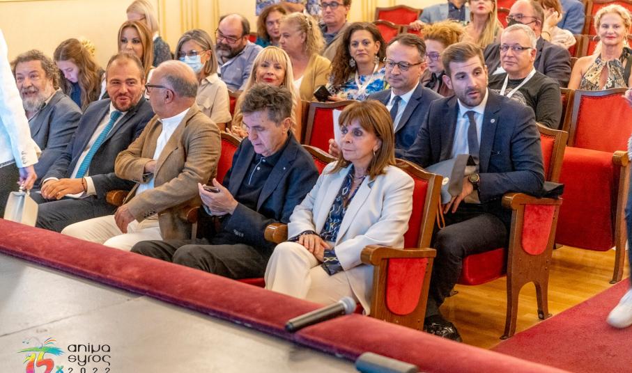 Το Πανεπιστήμιο Αιγαίου εκπροσωπούμενο από τον Αντιπρύτανη Διοικητικών Υποθέσεων, Καθηγητή Δημήτρη Παπαγεωργίου, τον Κοσμήτορα της Πολυτεχνικής Σχολής, Αναπληρωτή Καθηγητή, Πέτρο Καβάσαλη, και τον Πρόεδρο του Τμήματος Μηχανικών Σχεδίασης Προϊόντων και Συστημάτων, Αναπληρωτή Καθηγητή Παναγιώτη Κουτσαμπάση συμμετείχε, με ιδιαίτερη χαρά, στην τελετή ανακήρυξης της Προέδρου της Δημοκρατίας Κατερίνας Σακελαροπούλου, σε Επίτιμη Δημότη Σύρου – Ερμούπολης, καθώς και στην τελετή έναρξης του Διεθνούς Φεστιβάλ AnimaSyros, στο θέατρο Απόλλων της Ερμούπολης. Την έναρξη του Φεστιβάλ ανακοίνωσε η Πρόεδρος της Δημοκρατίας, η οποία στην ομιλία της έκανε ιδιαίτερη αναφορά στο Πανεπιστήμιο Αιγαίου και στο Τμήμα Μηχανικών Σχεδίασης Προϊόντων & Συστημάτων, αναφέροντας ότι: «…Χαίρομαι ιδιαίτερα που μέσα στις προτεραιότητες της δημοτικής αρχής είναι η διάσωση και ανάδειξη του αρχιτεκτονικού αποθέματος της νεοκλασικής Ερμούπολης και η μετατροπή του στρατοπέδου Λοχαγού Ζαφείρη σε μια σύγχρονη Πανεπιστημιούπολη…