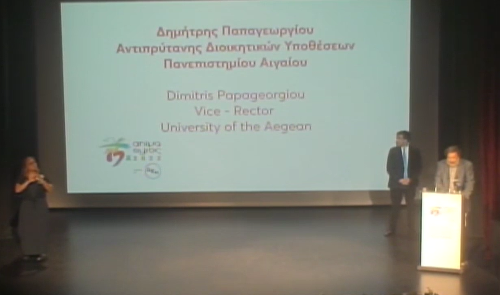 Μεταξύ των ομιλητών ήταν ο Αντιπρύτανης Διοικητικών Υποθέσεων, Καθηγητής Δημήτρης Παπαγεωργίου, ο οποίος σημείωσε τη διαχρονική συνεργασία του Φεστιβάλ με το Πανεπιστήμιο Αιγαίου και το Τμήμα Μηχανικών Σχεδίασης Προϊόντων και Συστημάτων που εδρεύει στη Σύρο ενώ επισήμανε ότι η συνεργασία μπορεί να επεκταθεί και με άλλα Tμήματα του Πανεπιστημίου που δραστηριοποιούνται στο χώρο του πολιτισμού και των δημιουργικών βιομηχανιών.