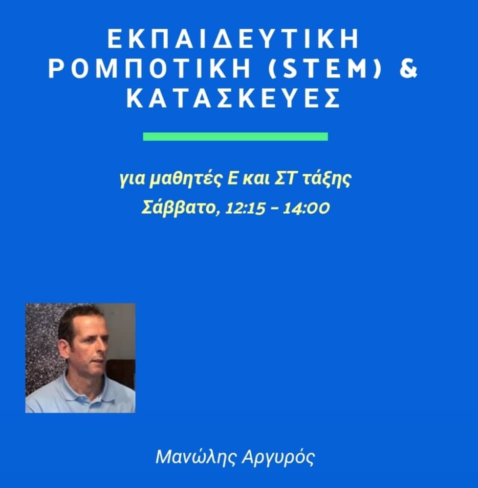 Εκπαιδευτική ρομποτική (stem) & κατασκευές, Μανώλης Αργυρός – (Ε και ΣΤ τάξης, Σάββατο, 12:15 – 14:00)