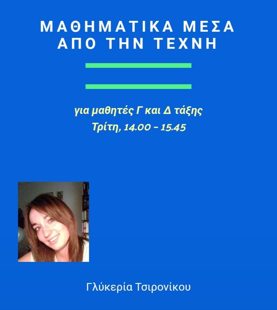 Μαθηματικά μέσα από την τέχνη, Γλυκερία Τσιρονίκου ( Γ και Δ τάξης, Τρίτη, 14.00 – 15.45)