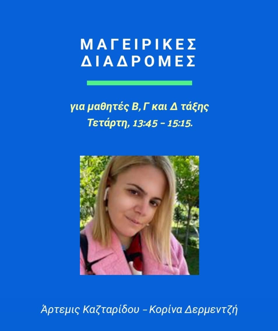 Μαγειρικές διαδρομές, Άρτεμις Καζταρίδου – Κορίνα Δερμεντζή (Β, Γ και Δ τάξης, Τετάρτη, 13:45 – 15:15)