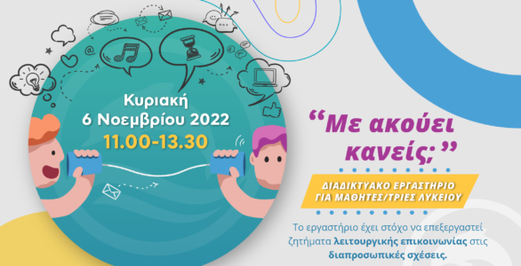 «Με ακούει κανείς;» – Κυριακή 6 Νοεμβρίου 2022, 11.00 – 13.30. Στόχος του εργαστηρίου είναι η επεξεργασία ζητημάτων λειτουργικής επικοινωνίας στις διαπροσωπικές σχέσεις.