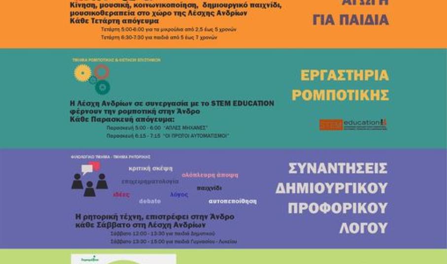 Σκάκι, Μουσικοκινητική, Ρομποτική, Δημιουργικός Προφορικός Λόγος (Ρητορική) και τα masterclasses της Χαρισμάθεια σε εβδομαδιαία βάση στο χώρο της Λέσχης Ανδρίων.