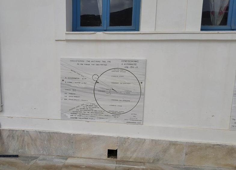 Συγκεκριμένα, το πρώτο έργο αφορά τον Υπολογισμό των ημερών του έτους σε 365 από τον Θαλή τον Μιλήσιο περίπου το 600 π.Χ., το δεύτερο έργο τη Χρυσή Τομή από τον Πυθαγόρα περίπου το 550 π.Χ. και το τρίτο έργο τον Υπολογισμό της Ακτίνας της Γης με ένα μπαστούνι και ένα πηγάδι  από τον Ερατοσθένη περίπου το 240 π.Χ. Τα τρία αυτά θέματα, ήρθαν να προστεθούν στο Αναλημματικό Ηλιακό ρολόι που τοποθετήθηκε το 2022 στον ίδιο χώρο και το Ανεμολόγιο που βρίσκεται ακριβώς έξω από την Αυλόπορτα του Δημοτικού Σχολείου και τοποθετήθηκε το 2021 αποτελούν μια ενότητα έργων  στο Δημοτικό  Σχολείο του Πύργου Τήνου.