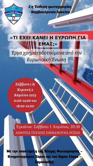 Το Πνευματικό Κέντρο (Αίθουσα Εμμανουήλ Ροΐδης), το Σάββατο 1 και την Κυριακή 2 Απριλίου, θα φιλοξενήσει την 2η έκθεση φωτογραφίας της Α’ και Β’ τάξης του Βαμβακάρειου Λυκείου των Εκπαιδευτηρίων Δελασάλ Σύρου με θέμα: «Tι έχει κάνει η Ευρώπη για εμάς; Έργα χρηματοδοτούμενα από την Ευρωπαϊκή Ένωση».