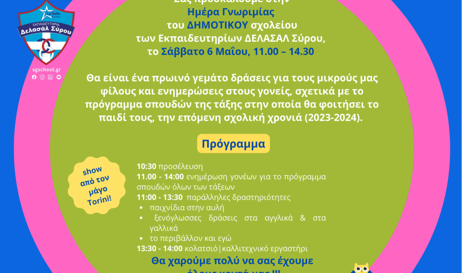 Τα Εκπαιδευτήρια ΔΕΛΑΣΑΛ Σύρου προσκαλούν όλους, γονείς και παιδιά (τάξεων Δημοτικού) της Σύρου, αυτό το Σάββατο 6 Μαΐου στο OPEN DAY του Δημοτικού, στις εγκαταστάσεις των Εκπαιδευτηρίων, σε μια ημέρα γνωριμίας με πολλές δραστηριότητες, ξενάγηση στους χώρους και πολλές εκπλήξεις.