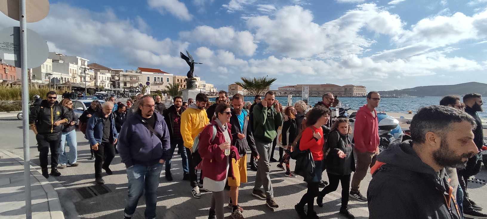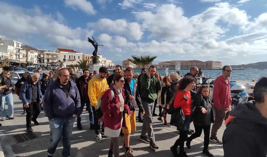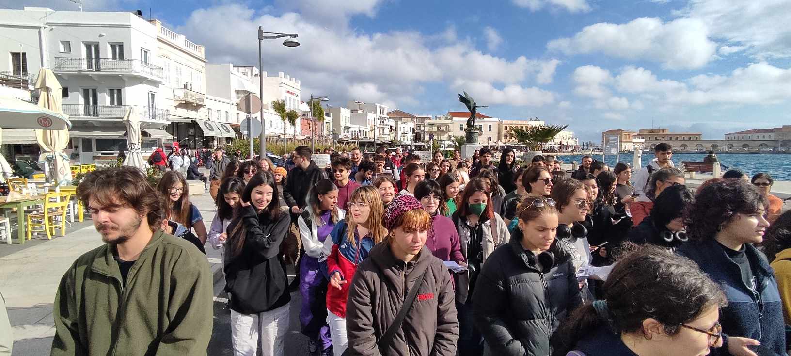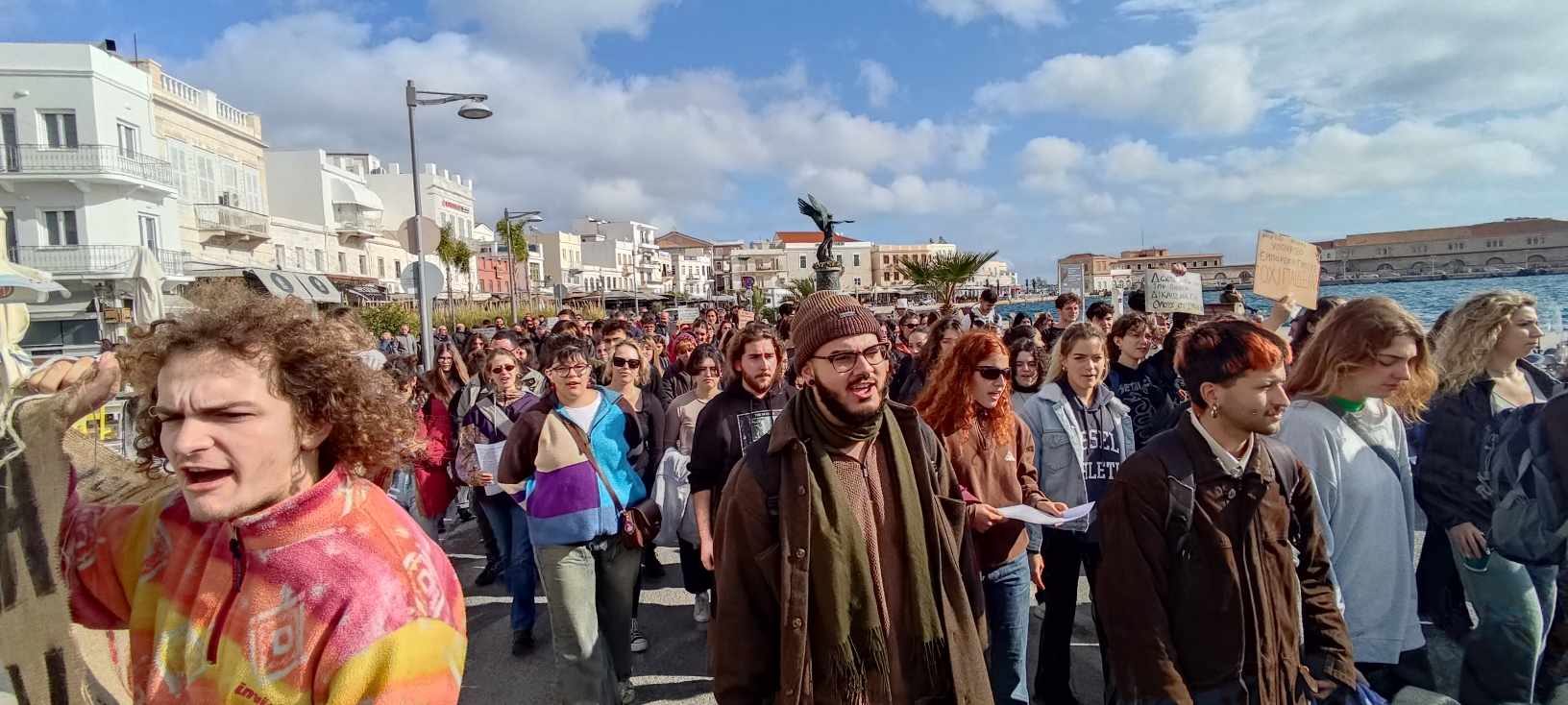 Στην πορεία που λαμβάνει χώρα αυτή τη στιγμή (13.00) με κατεύθυνση την πλατεία Ηρώων, οι φοιτητές πλαισιώνονται και από πολίτες του νησιού καθώς και από ορισμένους δημοτικούς συμβούλους της ελάσσονος μειοψηφίας.
