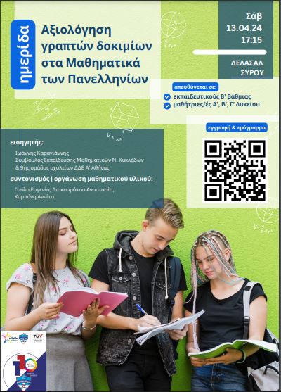 Ημερίδα για την αξιολόγηση των γραπτών δοκιμίων στα Μαθηματικά των Πανελλαδικών Εξετάσεων, θα πραγματοποιήσουν τα εκπαιδευτήρια ΔΕΛΑΣΑΛ Σύρου.