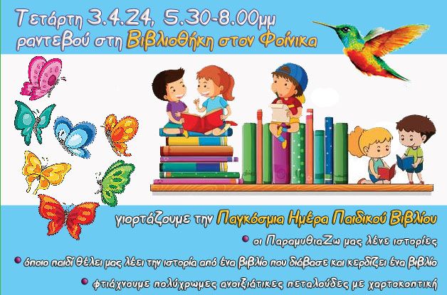 Η κοινοτική Βιβλιοθήκη στον Φοίνικα, Παιδική & Εφηβική, Συνεργατική & Δανειστική γιορτάζει την Παγκόσμια Ημέρα Παιδικού Βιβλίου την Τετάρτη 3 Απριλίου 2024, μια μέρα μετά την επίσημη, 5.30‑8.00μμ, με μια αφιερωματική εκδήλωση.