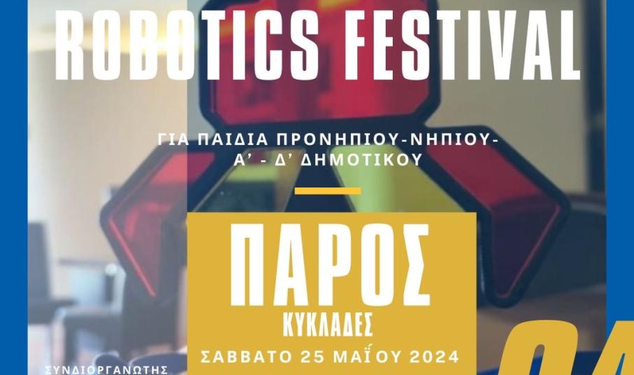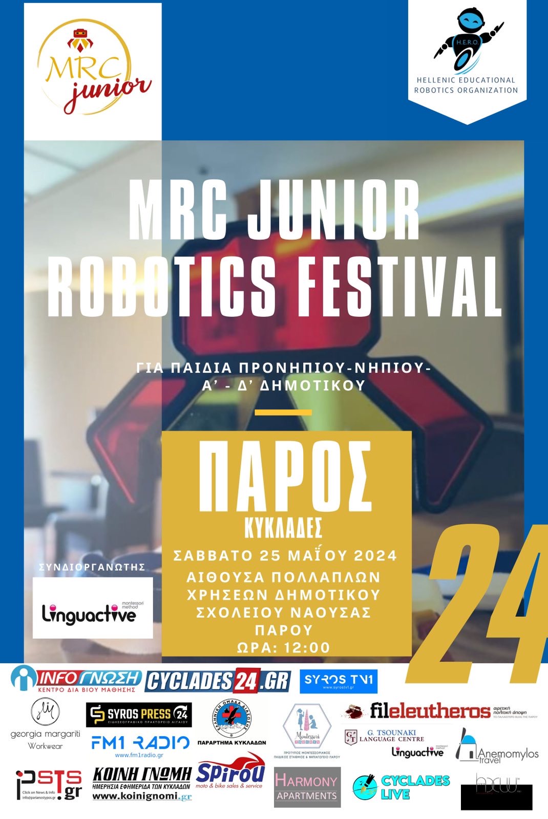 Στο πλαίσιο αυτό, πραγματοποιεί για πρώτη φορά στις Κυκλάδες, το 1ο Φεστιβάλ Αθλητικής Ρομποτικής MRC Junior, στο οποίο θα συμμετάσχουν μαθητές των προνηπιακών και νηπιακών, τάξεων, καθώς και της Δ' τάξης των δημοτικών σχολείων Πάρου και Νάξου.