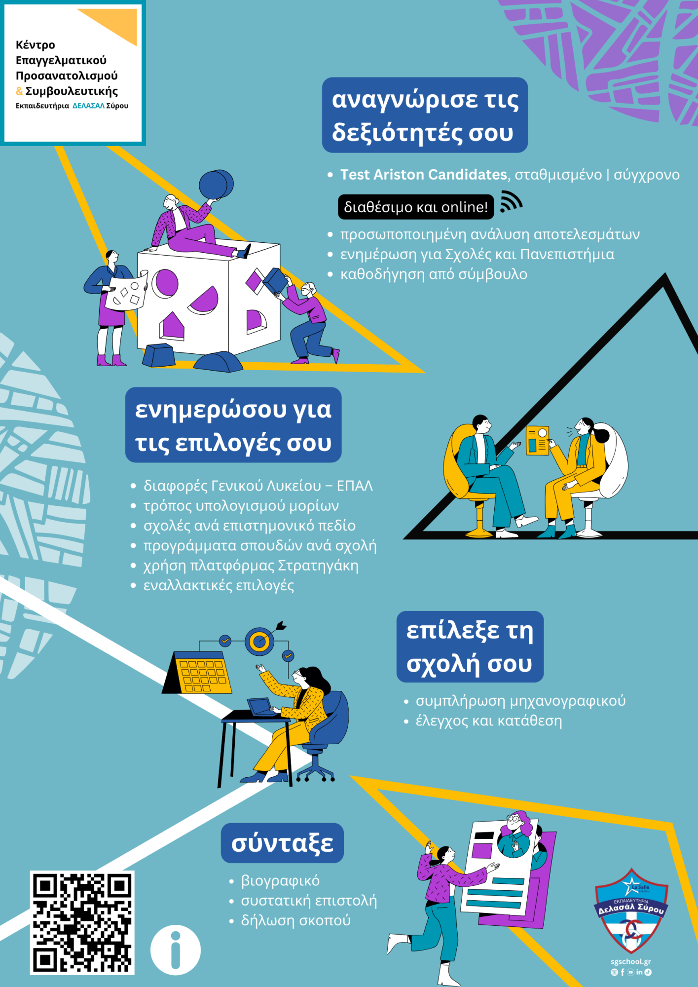 Με επίκεντρο τη γενικότερη προσφορά προς το κοινωνικό σύνολο της Σύρου, τα εκπαιδευτήρια Δελασάλ, έχουν δημιουργήσει το Κέντρο Επαγγελματικού Προσανατολισμού και Συμβουλευτικής.