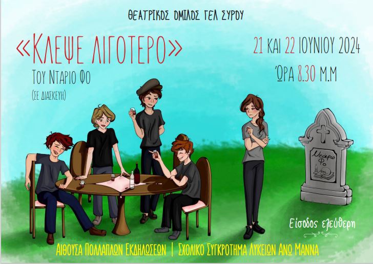 Τη διασκευή του έργου του Ντάριο Φο "Κλέψε λιγότερο", παρουσιάζουν την Παρασκευή 21 και το Σάββατο 22 Ιουνίου στις 8 και μισή το βράδυ στην αίθουσα πολλαπλών χρήσεων "Κ. Τουλούπης", στο σχολικό συγκρότημα του Μάννα, με είσοδο ελεύθερη για το κοινό, τα μέλη του θεατρικού ομίλου του ΓΕΛ Σύρου.