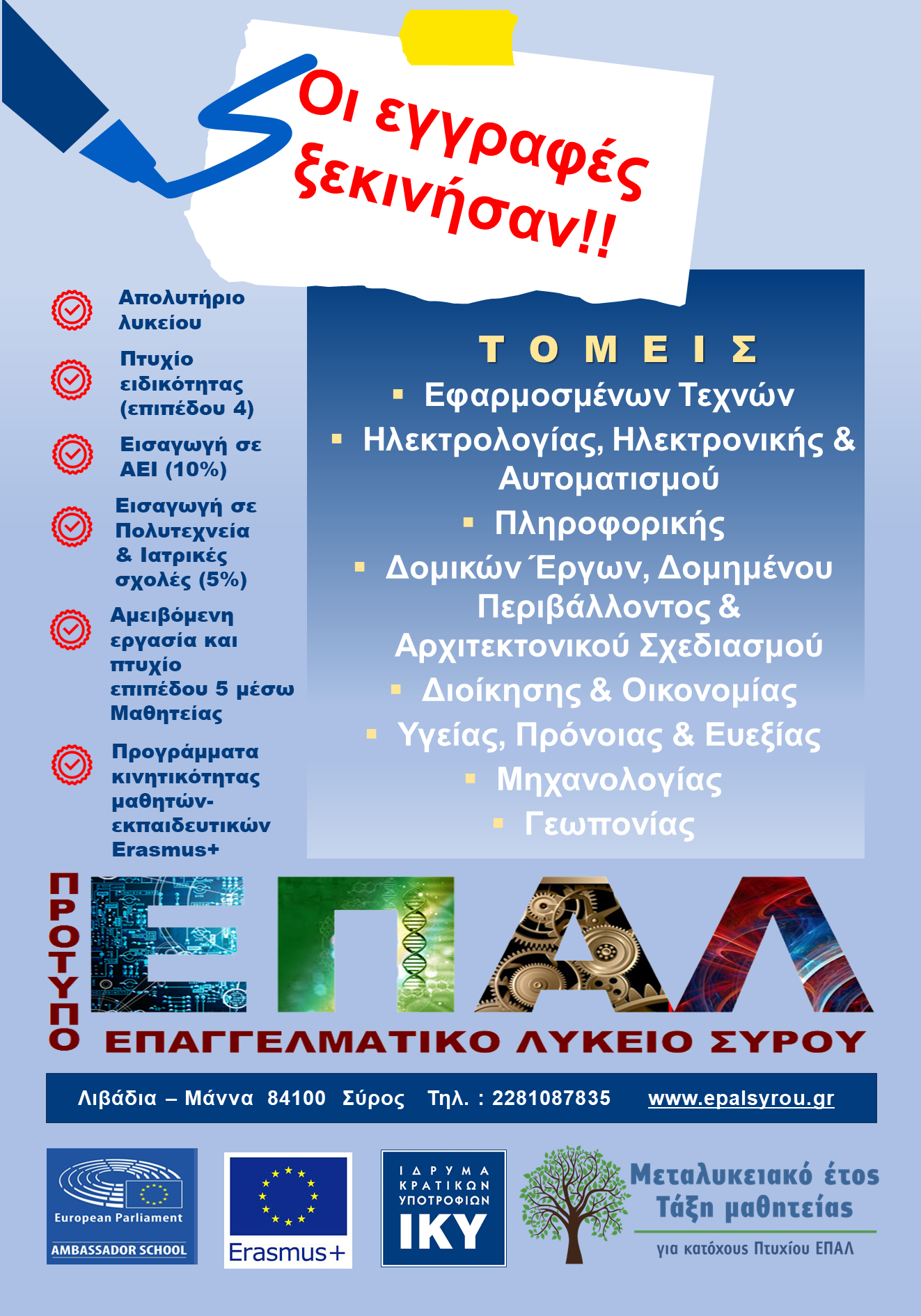 Επισημαίνεται ότι από το έτος 2024-25 το ΕΠΑ.Λ Σύρου λειτουργεί εξολοκλήρου ως Πρότυπο ΕΠΑ.Λ (Π.ΕΠΑ.Λ). Πληροφορίες στο Π.ΕΠΑ.Λ Σύρου 9.00πμ με 13.00μμ, τηλ. 2281087835 και 2281082731.''