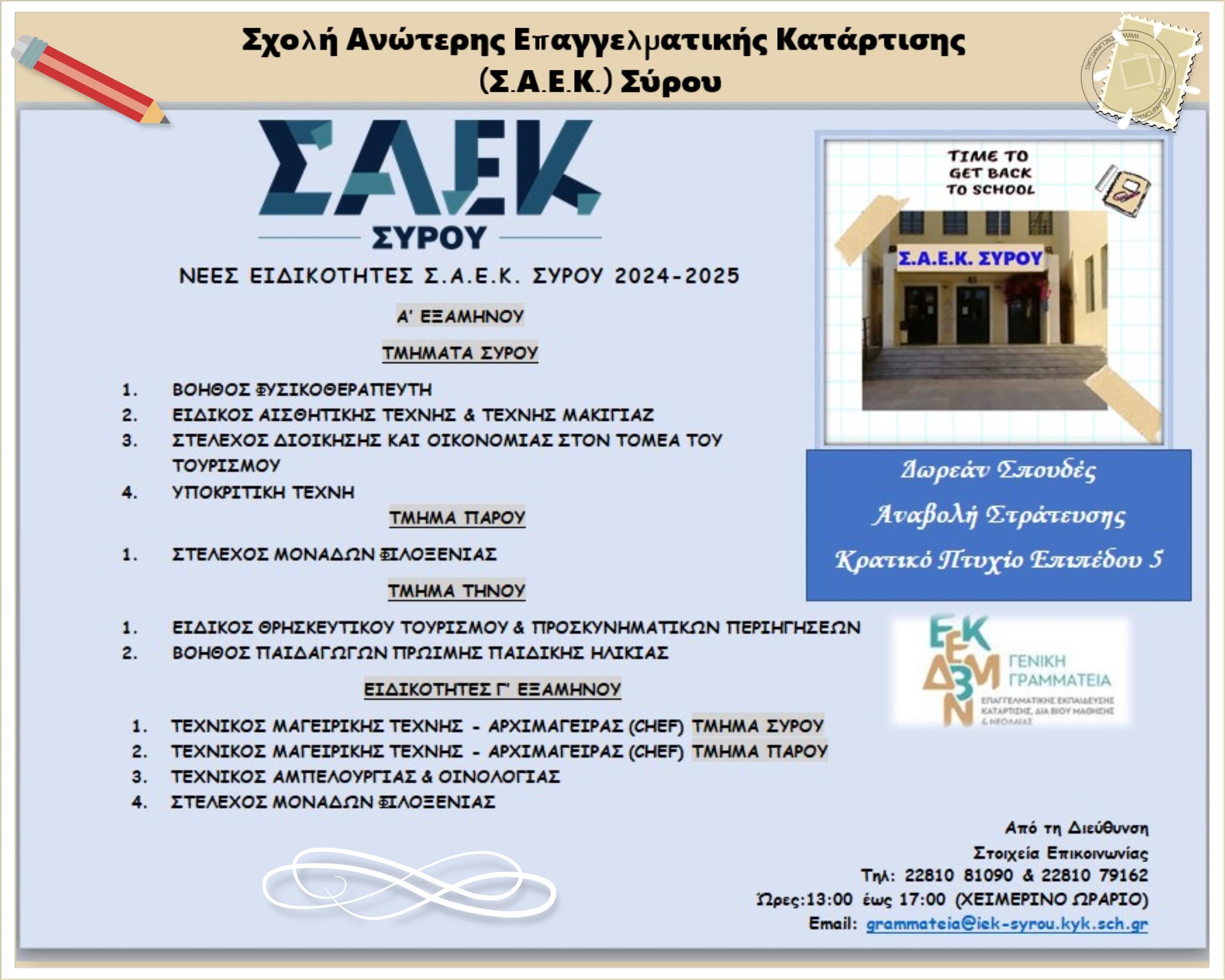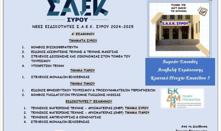 Νέες εκπαιδευτικές προκλήσεις για τους καταρτιζόμενους της Σύρου, της Τήνου και της Πάρου, ανοίγουν οι νέες ειδικότητες, που θα λειτουργήσουν από την καινούργια σχολική περίοδο στη Σχολή Ανώτερης Επαγγελματικής Κατάρτισης (Σ.Α.Ε.Κ) Σύρου.