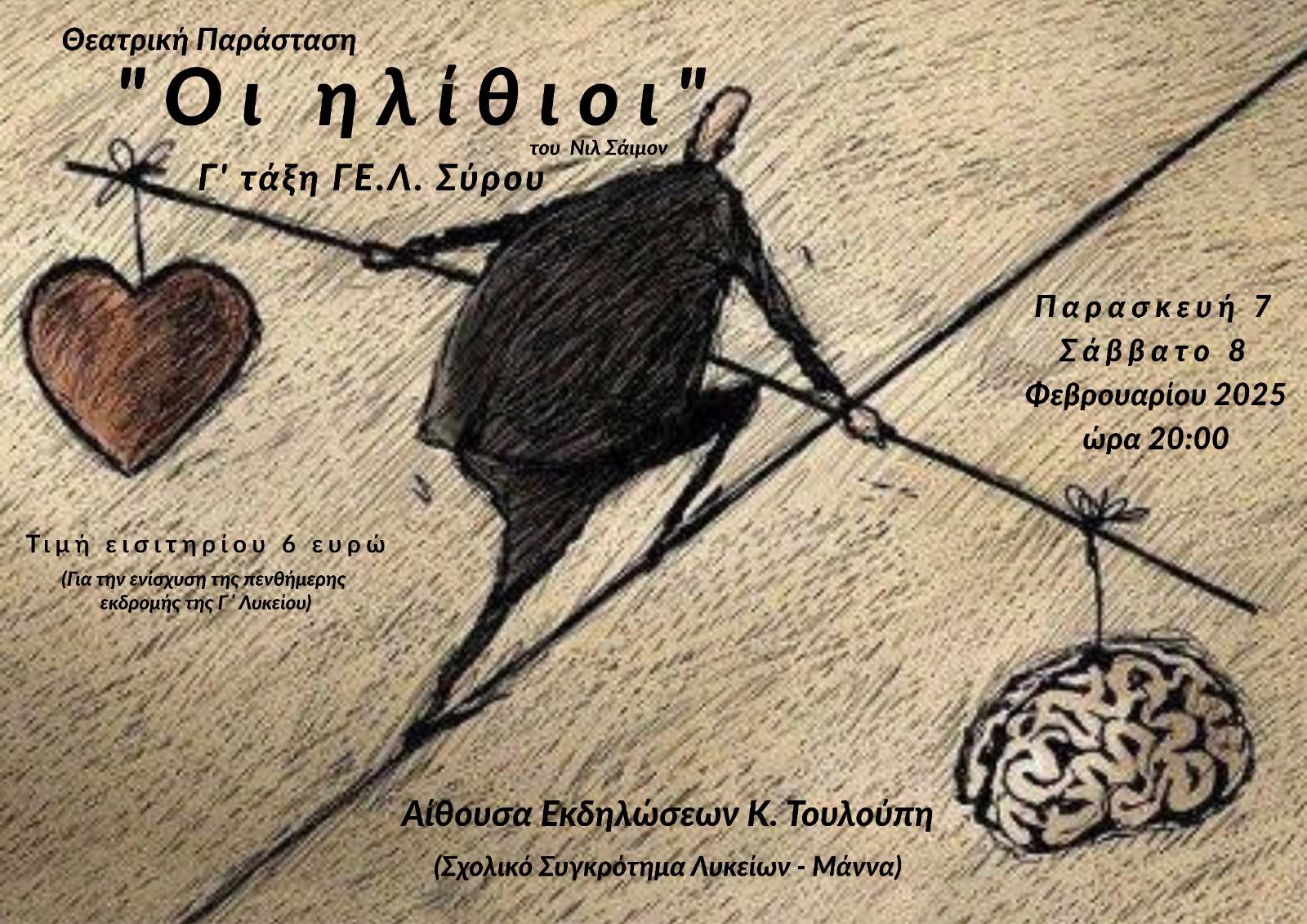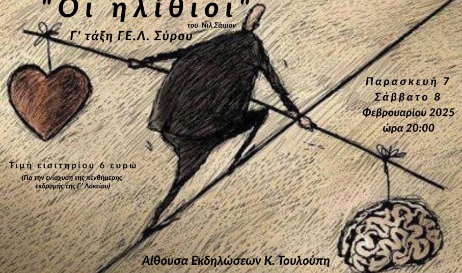 Οι μαθητές της Γ' τάξης του Γενικού Λυκείου Σύρου, επανέρχονται στο θεατρικό σανίδι για μία ακόμη χρονιά, παρουσιάζοντας φέτος το έργο "Οι Ηλίθιοι" του Νηλ Σάιμον.