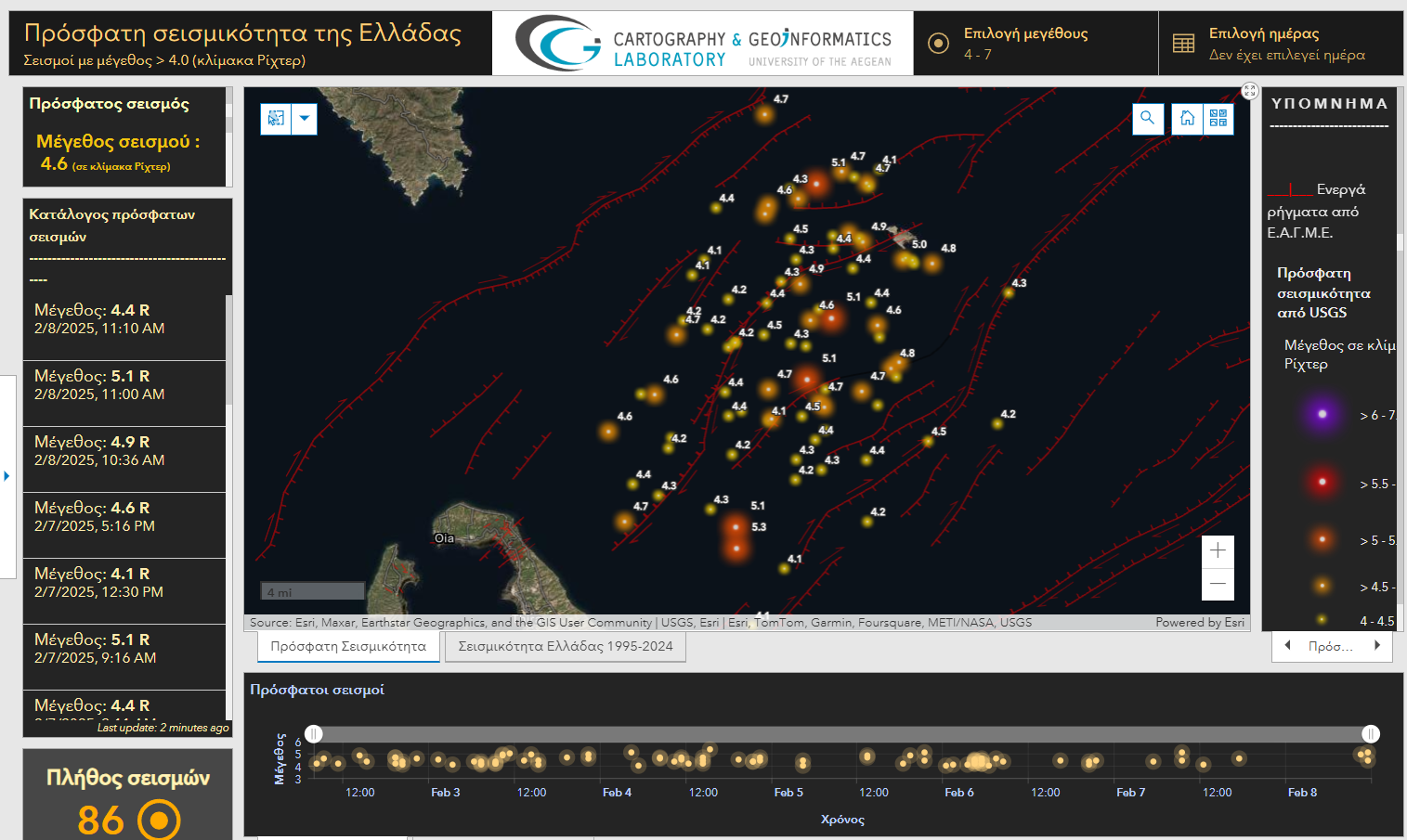 Το Εργαστήριο Χαρτογραφίας και Γεωπληροφορικής του Τμήματος Γεωγραφίας του Πανεπιστημίου Αιγαίου ανακοινώνει την έναρξη λειτουργίας μιας διαδικτυακής πλατφόρμας, η οποία παρέχει τη δυνατότητα χαρτογράφησης και οπτικής διερεύνησης - ανάλυσης της πρόσφατης σεισμικότητας του ελληνικού χώρου. Η πλατφόρμα προσφέρει πρόσβαση σε γεωχωρικά δεδομένα πρόσφατων σεισμών, ενεργών ρηγμάτων και προγενέστερων σεισμικών γεγονότων, με σκοπό την εκπαιδευτική χρήση για την κατανόηση του φαινομένου της σεισμικότητας. Τα δεδομένα ανανεώνονται σε σχεδόν πραγματικό χρόνο, καθιστώντας το εργαλείο ιδιαίτερα χρήσιμο για τις ανάγκες εκπαιδευτικών φορέων.